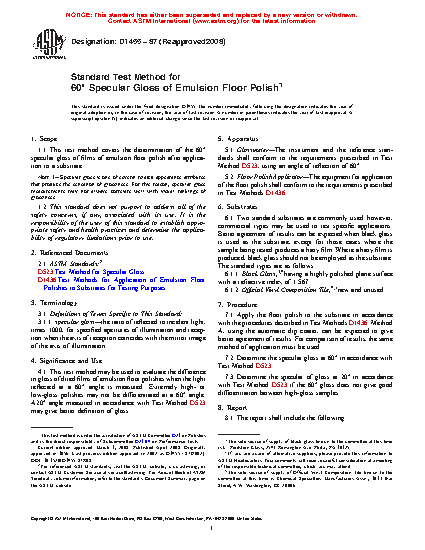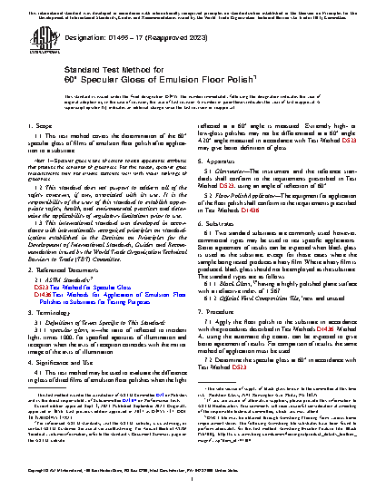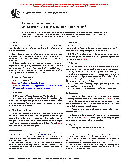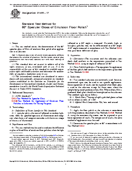 1.1 This test method covers the determination of the 60° specular gloss of films of emulsion floor polish after application to a substrate.