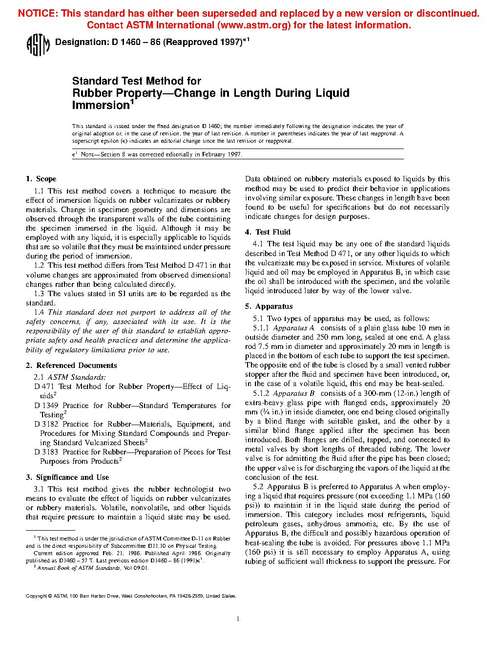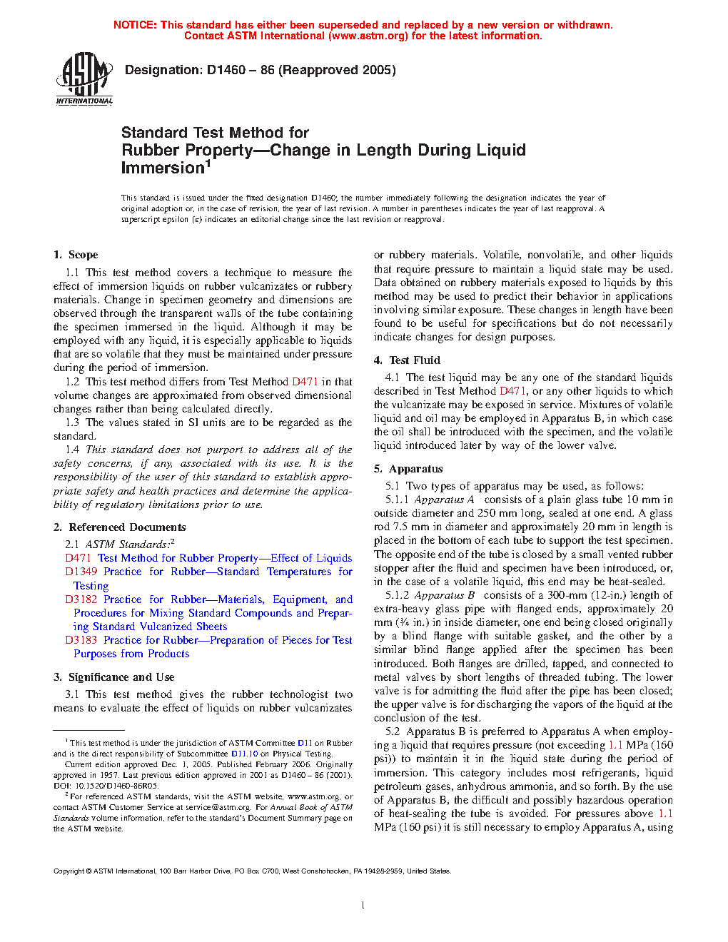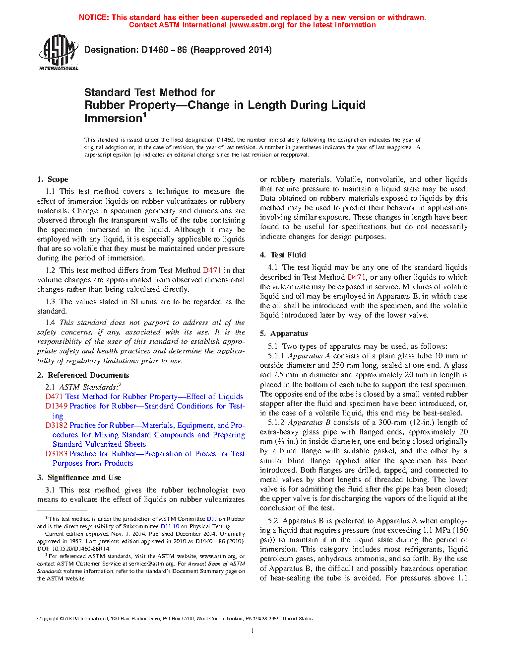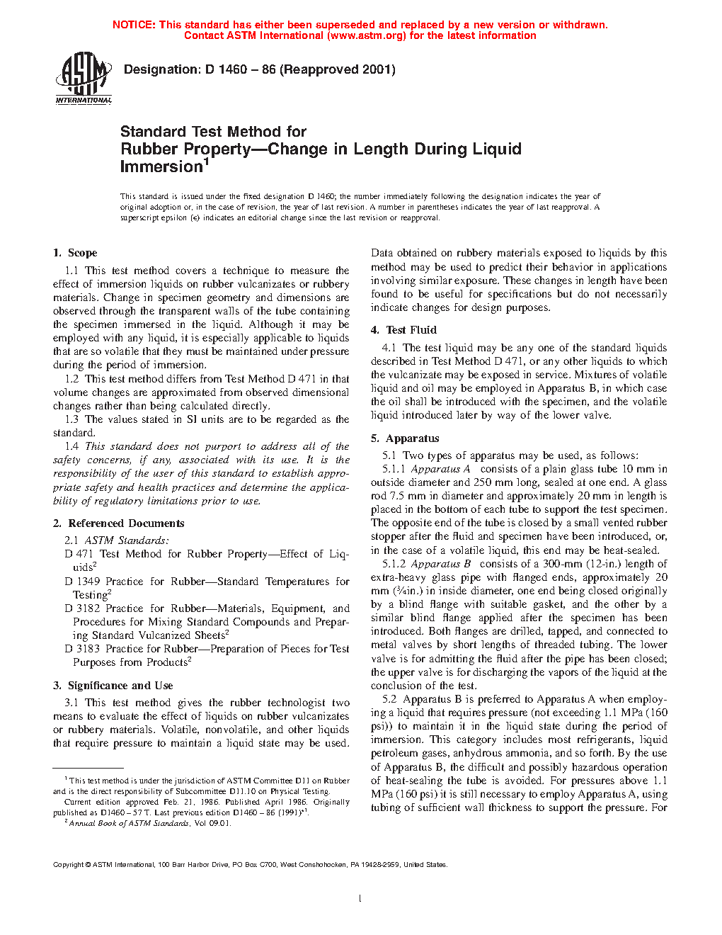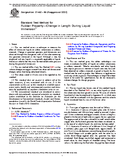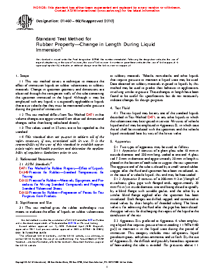 3.1 This test method gives the rubber technologist two means to evaluate the effect of liquids on rubber vulcanizates or rubbery materials. Volatile, nonvolatile, and other liquids that require pressure to maintain a liquid state may be used. Data obtained on rubbery materials exposed to liquids by this method may be used to predict their behavior in applications involving similar exposure. These changes in length have been found to be useful for specifications but do not necessarily indicate changes for design purposes.