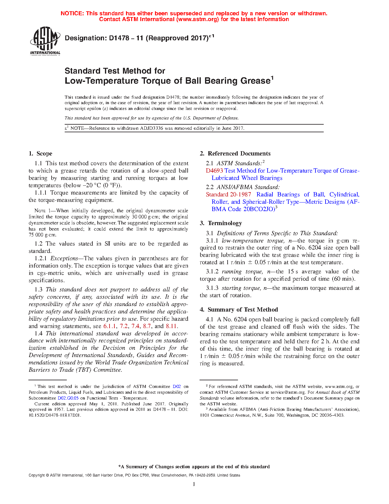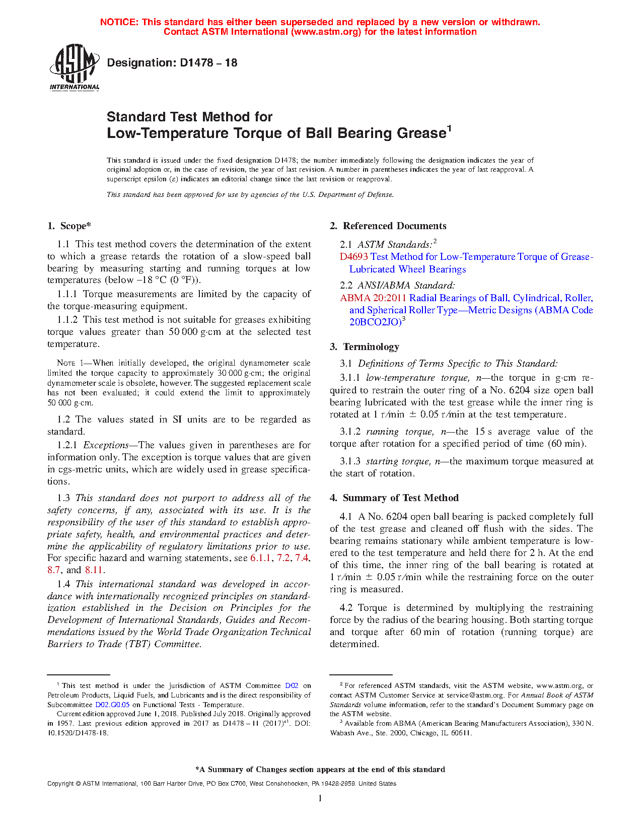 1.1 This test method covers the determination of the extent to which a grease retards the rotation of a slow-speed ball bearing by measuring starting and running torques at low temperatures (below -18 °C (0 °F)).