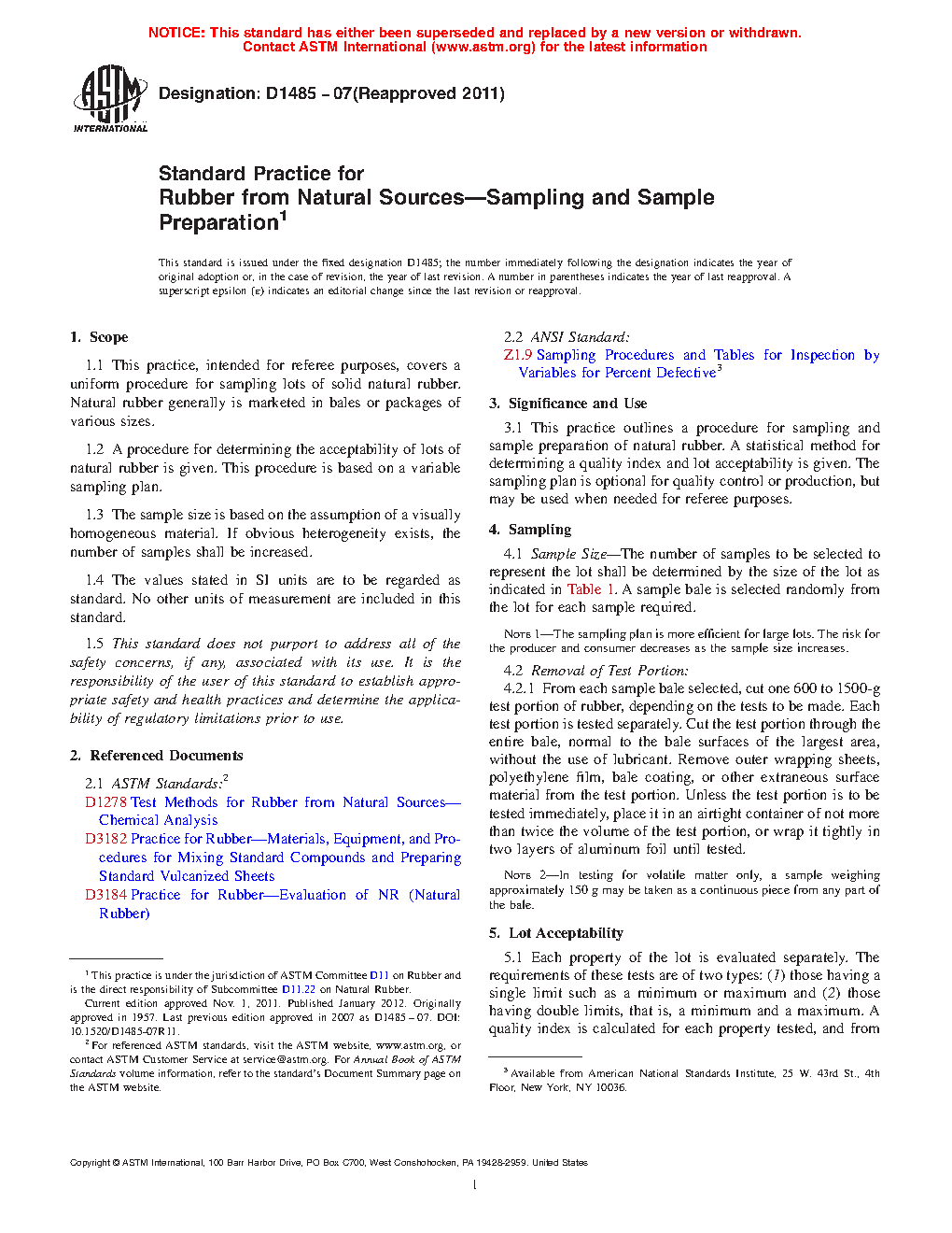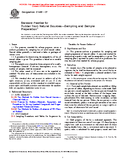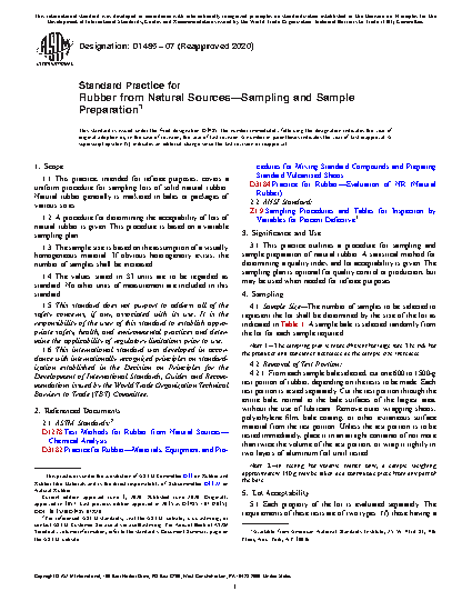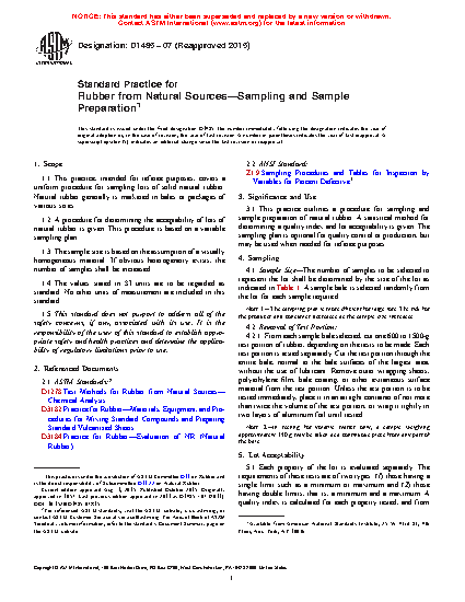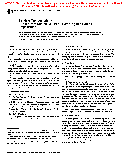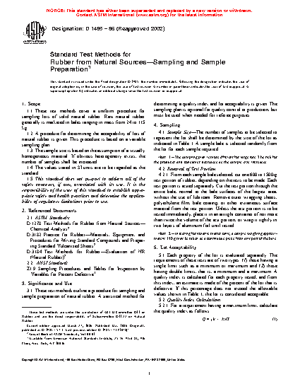 3.1 This practice outlines a procedure for sampling and sample preparation of natural rubber. A statistical method for determining a quality index and lot acceptability is given. The sampling plan is optional for quality control or production, but may be used when needed for referee purposes.