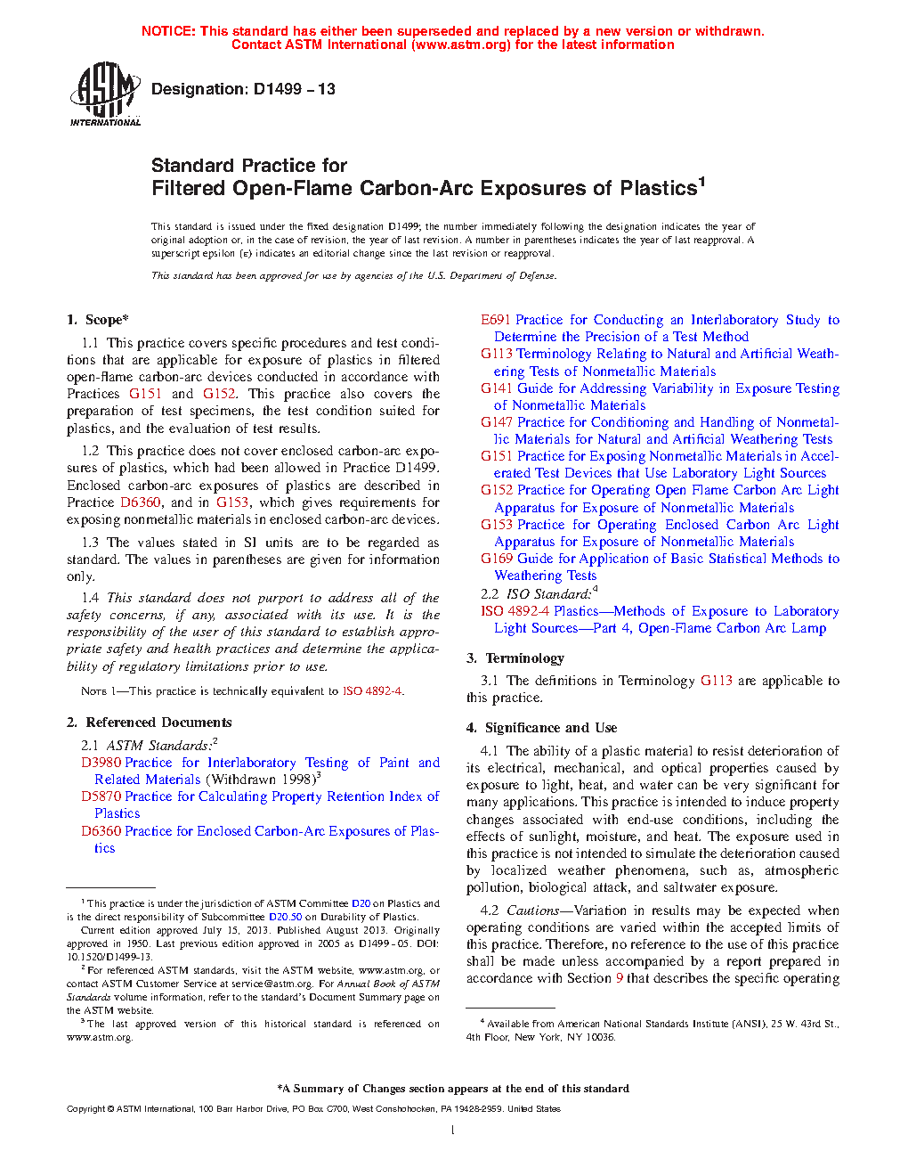 1.2 This practice does not cover enclosed carbon-arc exposures of plastics, which had been allowed in Practice D1499. Enclosed carbon-arc exposures of plastics are described in Practice D6360, and in G153, which gives requirements for exposing nonmetallic materials in enclosed carbon-arc devices.