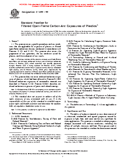 1.1 This practice covers specific procedures and test conditions that are applicable for exposure of plastics in filtered open-flame carbon-arc devices conducted in accordance with Practices G151 and G152. This practice also covers the preparation of test specimens, the test condition suited for plastics, and the evaluation of test results.