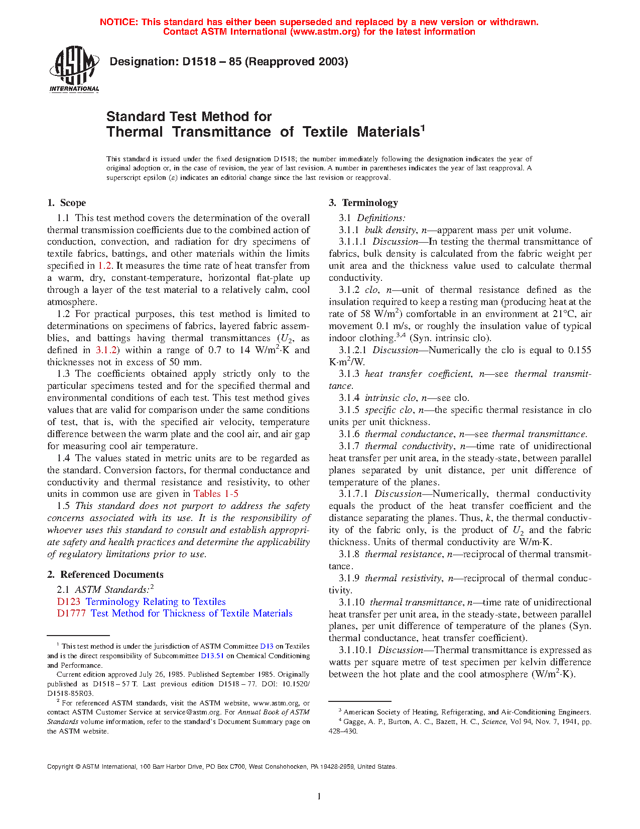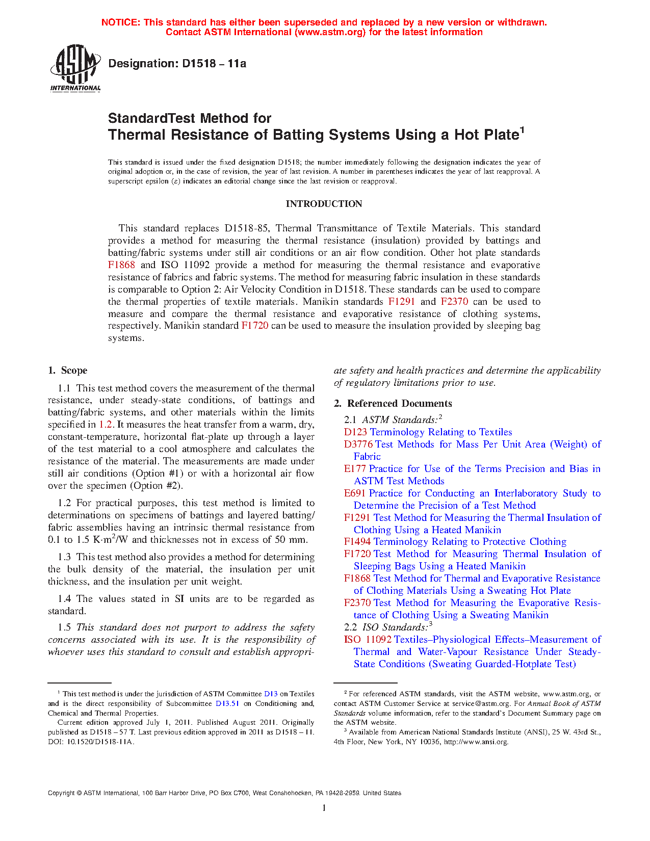 1.2 For practical purposes, this test method is limited to determinations on specimens of battings and layered batting/fabric assemblies having an intrinsic thermal resistance from 0.1 to 1.5 K·m2/W and thicknesses not in excess of 50 mm.