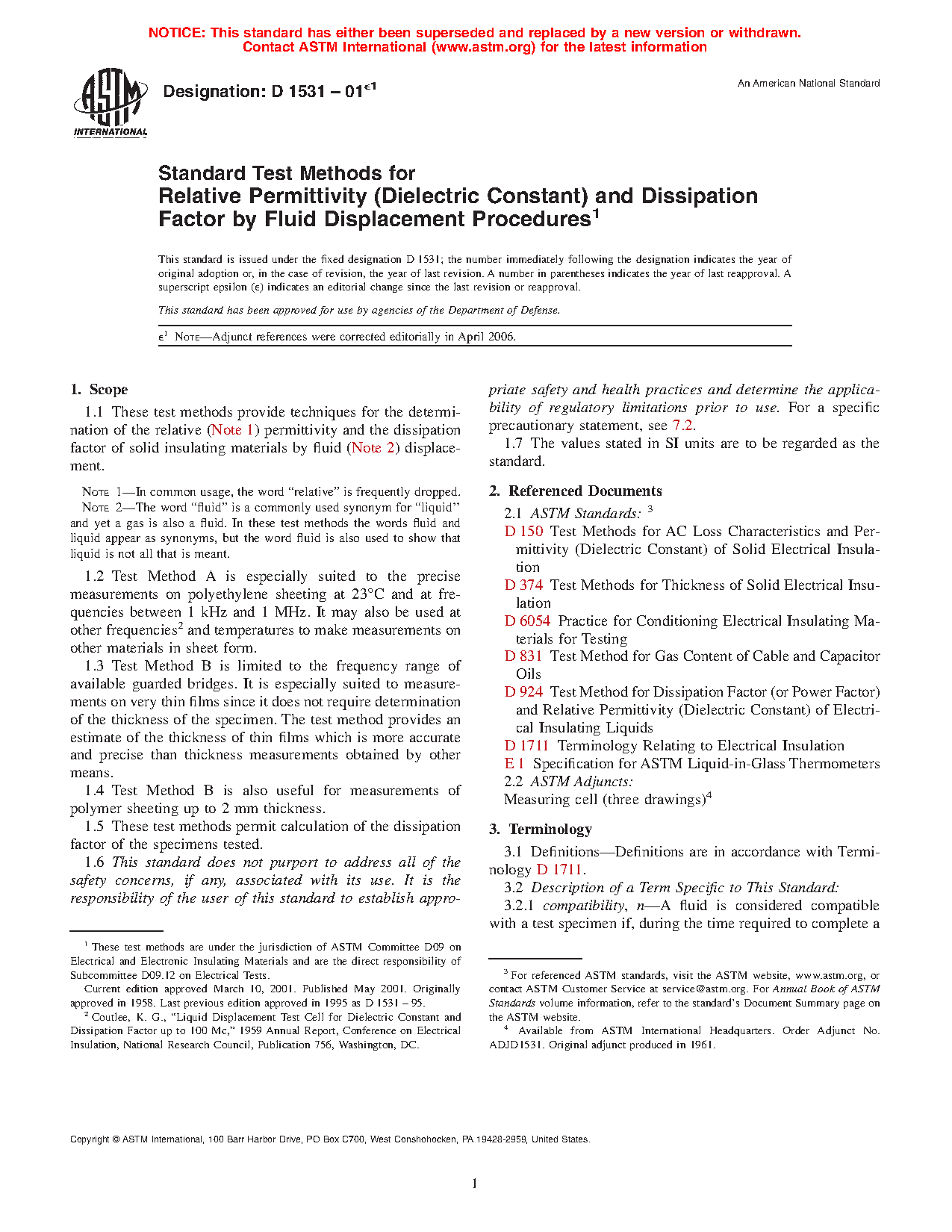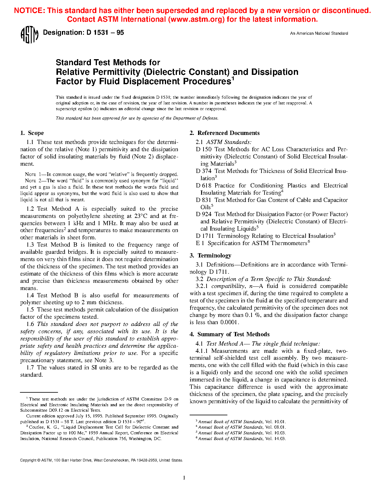 1.1 These test methods provide techniques for the determination of the relative (Note 1) permittivity and the dissipation factor of solid insulating materials by fluid (Note 1) displacement.