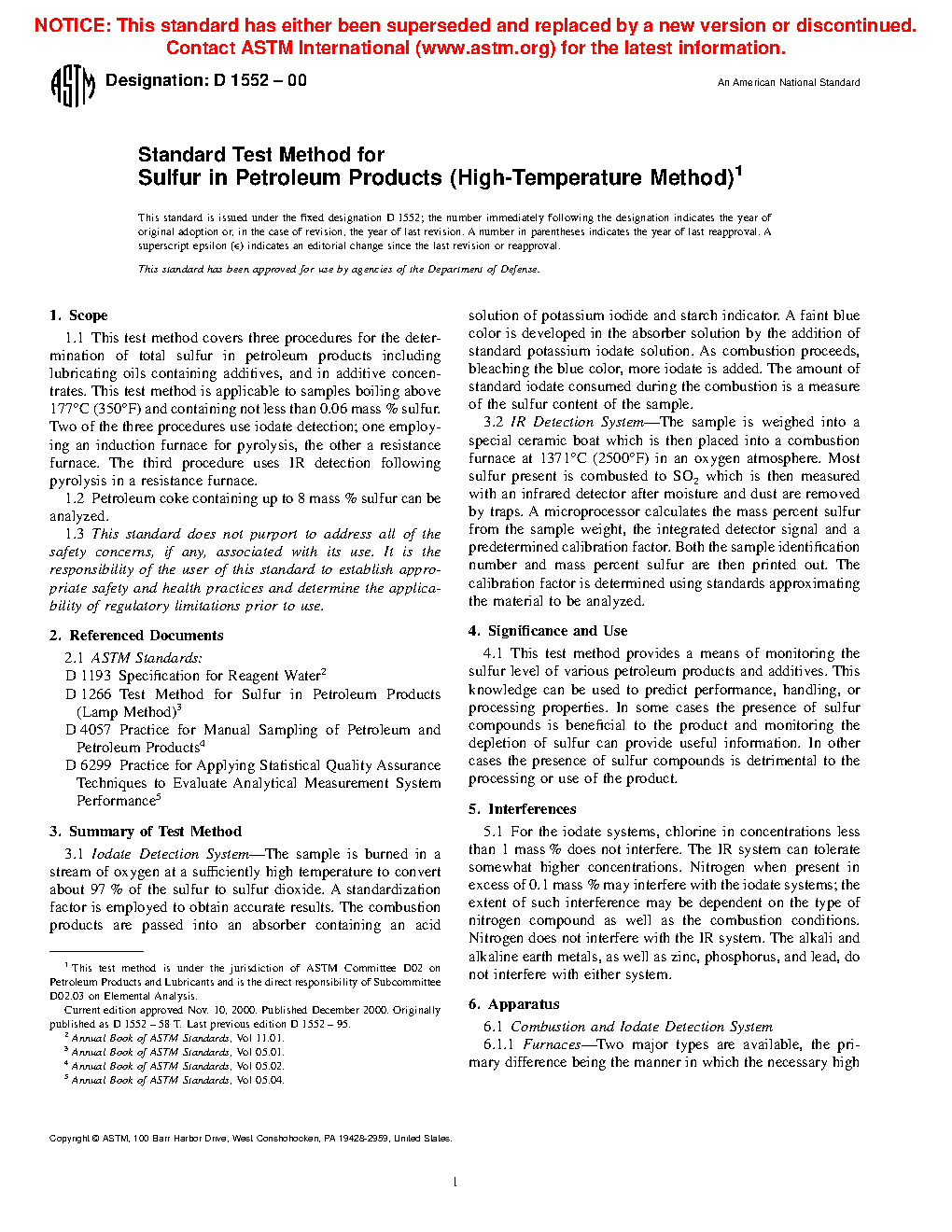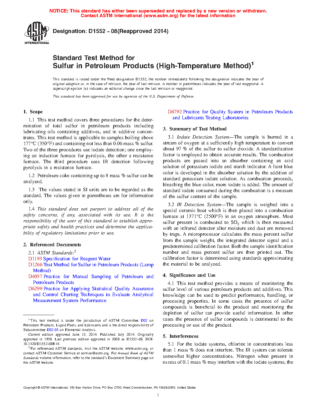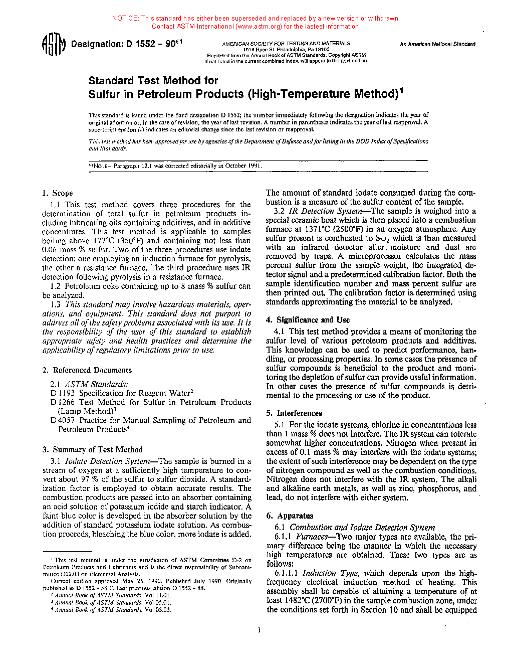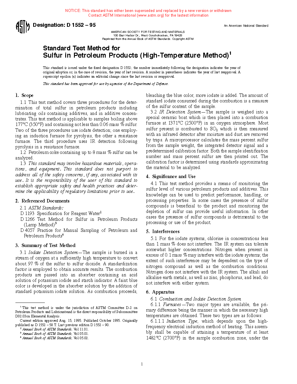 Note 1: The D1552–08 (2014) version of this standard contained two other procedures using iodate titrations. Since these procedures are no longer being used in the industry laboratories based on a survey of D02.SC 3 laboratories conducted in September 2014, they are being deleted. For earlier information on the deleted procedures, D1552–08 (2014) may be perused.