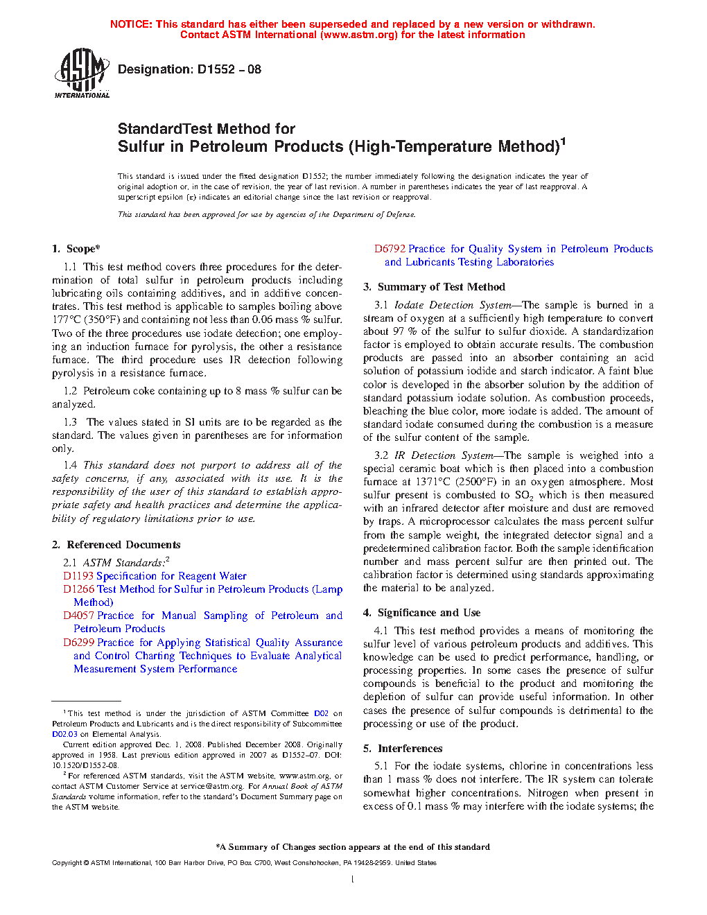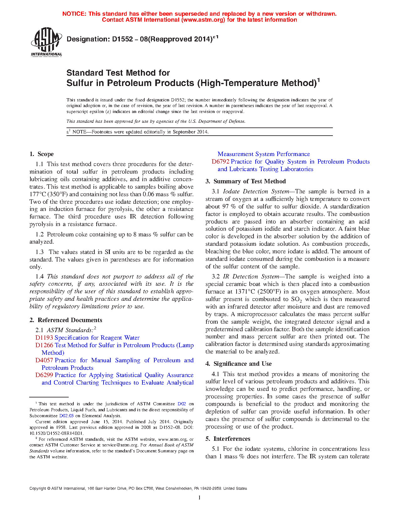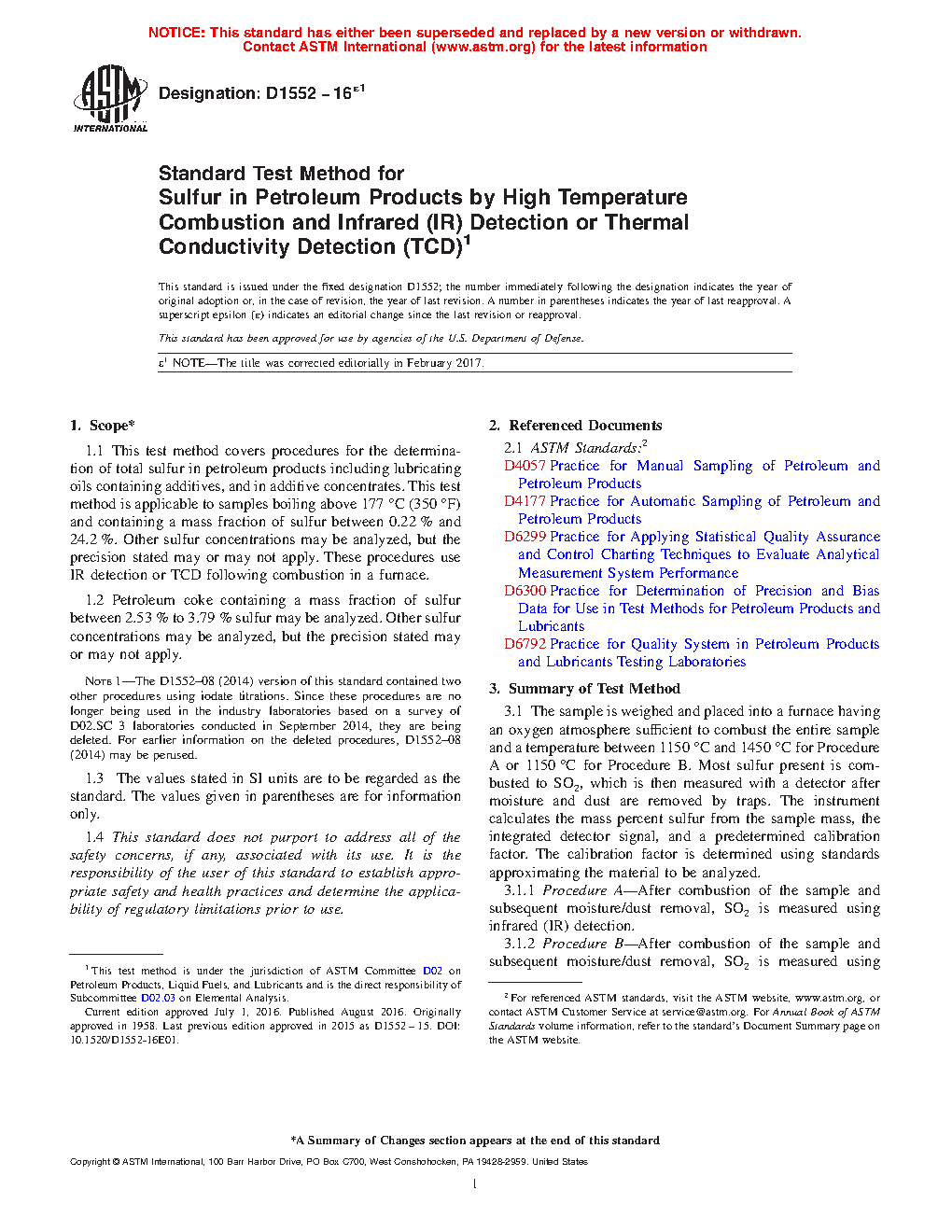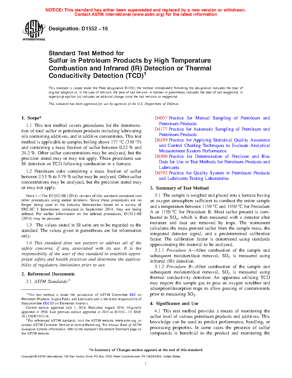 Note 1: The D1552–08 (2014) version of this standard contained two other procedures using iodate titrations. Since these procedures are no longer being used in the industry laboratories based on a survey of D02.SC 3 laboratories conducted in September 2014, they are being deleted. For earlier information on the deleted procedures, D1552–08 (2014) may be perused.