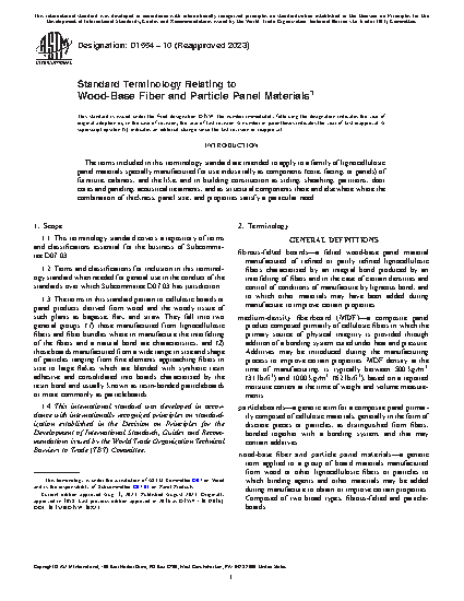 1.3 The terms in this standard pertain to cellulosic boards or panel products derived from wood and the woody tissue of such plants as bagasse, flax, and straw. They fall into two general groups: (1) those manufactured from lignocellulosic fibers and fiber bundles where in manufacture the interfelting of the fibers and a natural bond are characteristics, and (2) those boards manufactured from a wide range in size and shape of particles ranging from fine elements approaching fibers in size to large flakes which are blended with synthetic resin adhesive and consolidated into boards characterized by the resin bond and usually known as resin-bonded particleboards or more commonly as particleboards.