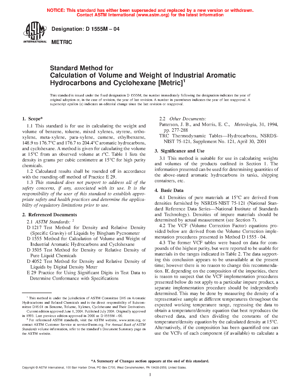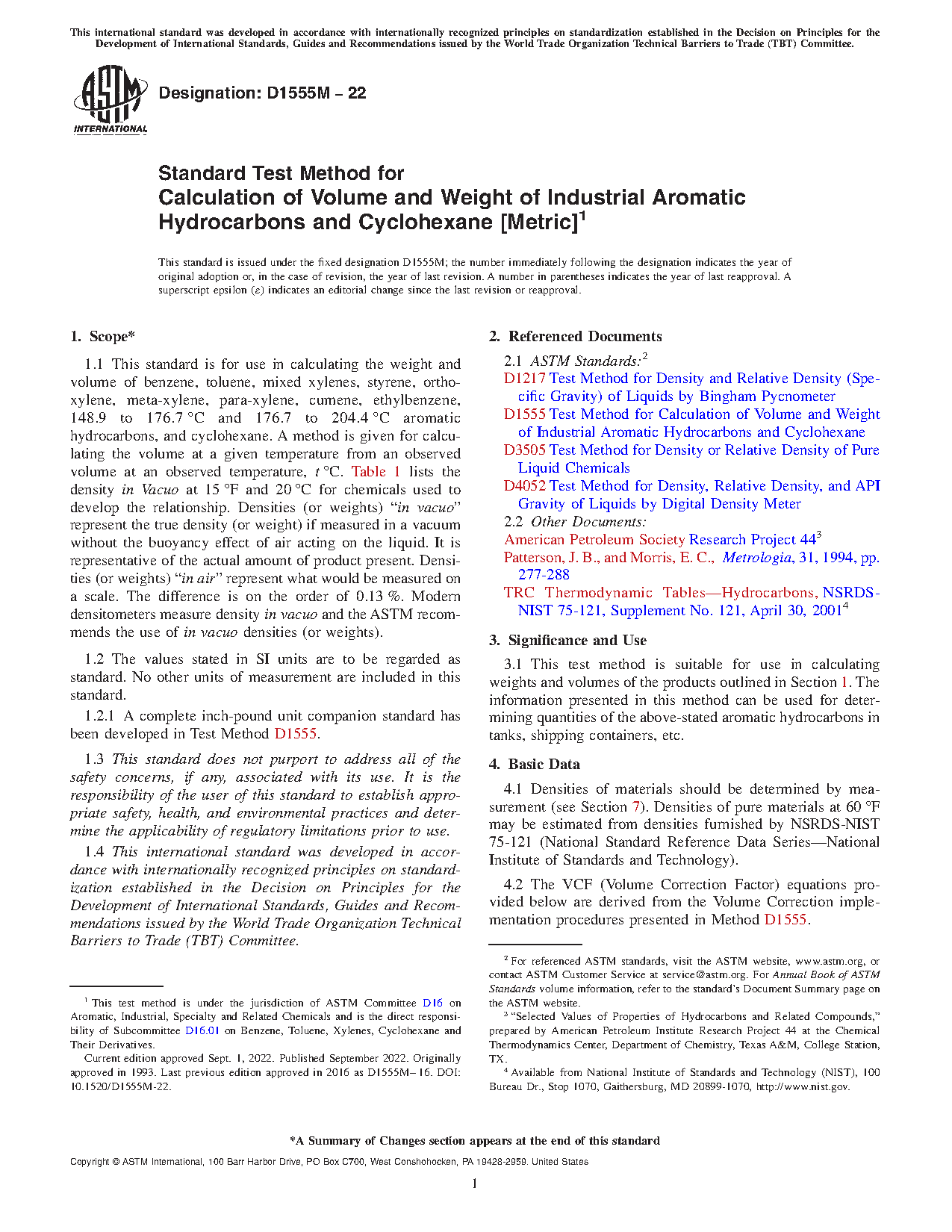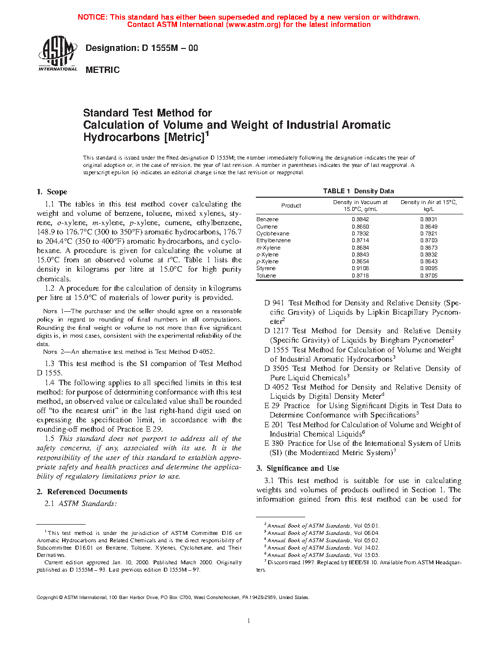 1.1 This standard is for use in calculating the weight and volume of benzene, toluene, mixed xylenes, styrene, ortho-xylene, meta-xylene, para-xylene, cumene, ethylbenzene, 148.9 to 176.7 °C and 176.7 to 204.4 °C aromatic hydrocarbons, and cyclohexane. A method is given for calculating the volume at a given temperature from an observed volume at an observed temperature, t °C. Table 1 lists the density in Vacuo at 15 °F and 20 °C for chemicals used to develop the relationship. Densities (or weights) “in vacuo” represent the true density (or weight) if measured in a vacuum without the buoyancy effect of air acting on the liquid. It is representative of the actual amount of product present. Densities (or weights) “in air” represent what would be measured on a scale. The difference is on the order of 0.13 %. Modern densitometers measure density in vacuo and the ASTM recommends the use of in vacuo densities (or weights).