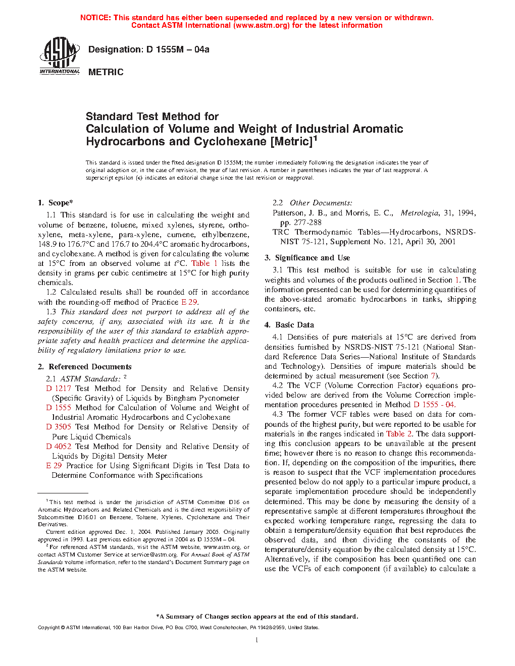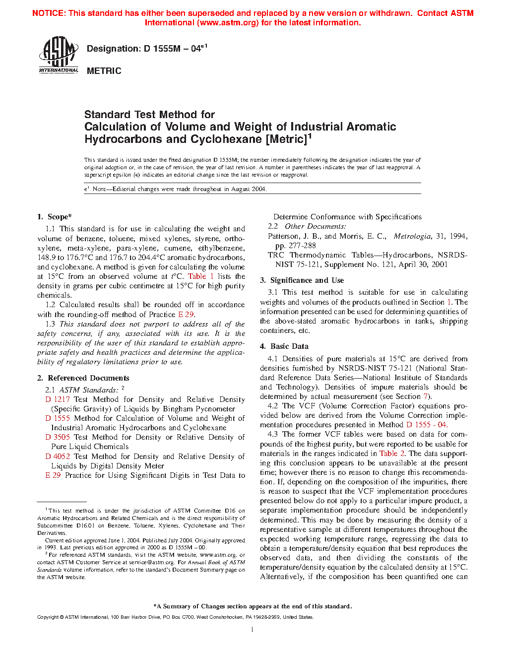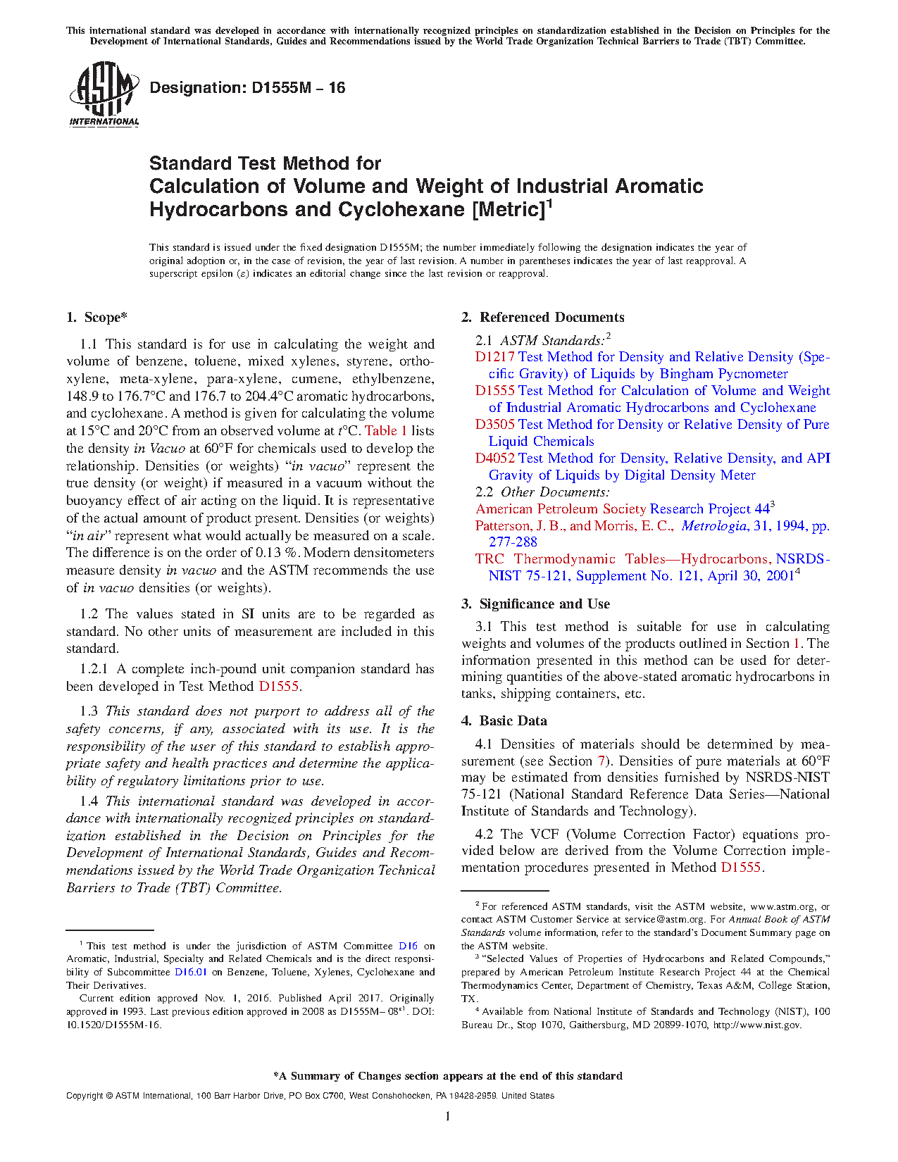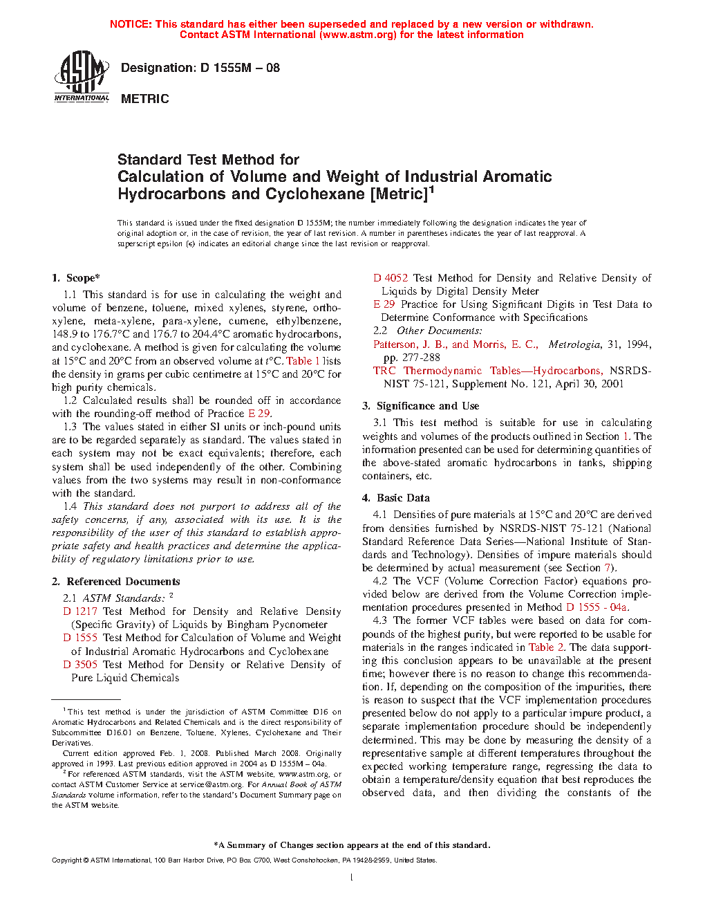 1.1 This standard is for use in calculating the weight and volume of benzene, toluene, mixed xylenes, styrene, ortho-xylene, meta-xylene, para-xylene, cumene, ethylbenzene, 148.9 to 176.7 °C and 176.7 to 204.4 °C aromatic hydrocarbons, and cyclohexane. A method is given for calculating the volume at a given temperature from an observed volume at an observed temperature, t °C. Table 1 lists the density in Vacuo at 15 °F and 20 °C for chemicals used to develop the relationship. Densities (or weights) “in vacuo” represent the true density (or weight) if measured in a vacuum without the buoyancy effect of air acting on the liquid. It is representative of the actual amount of product present. Densities (or weights) “in air” represent what would be measured on a scale. The difference is on the order of 0.13 %. Modern densitometers measure density in vacuo and the ASTM recommends the use of in vacuo densities (or weights).