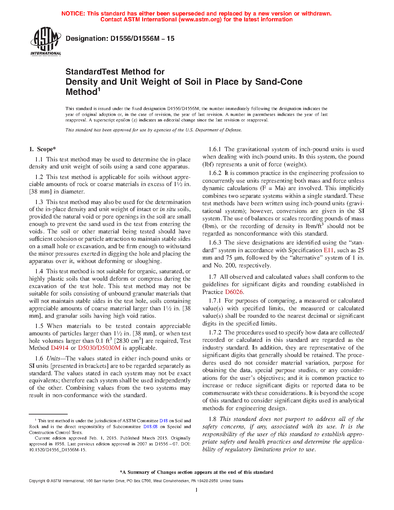 1.1 This test method may be used to determine the in-place density and unit weight of soils using a sand cone apparatus.
