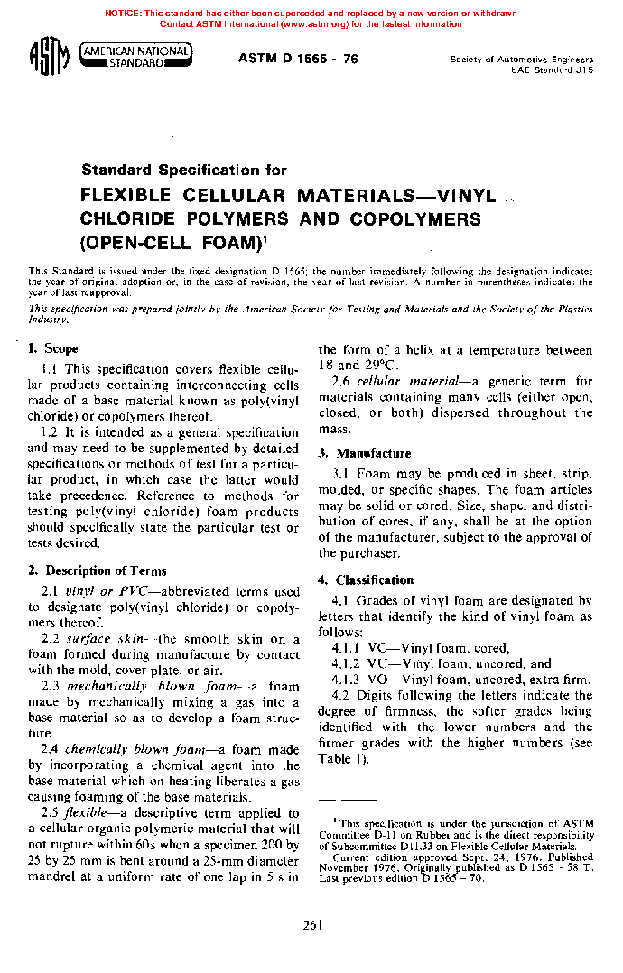 Specification for Flexible Cellular Materials-Vinyl Chloride Polymers and Copolymers (Open-Cell Foam) (Withdrawn 1998)