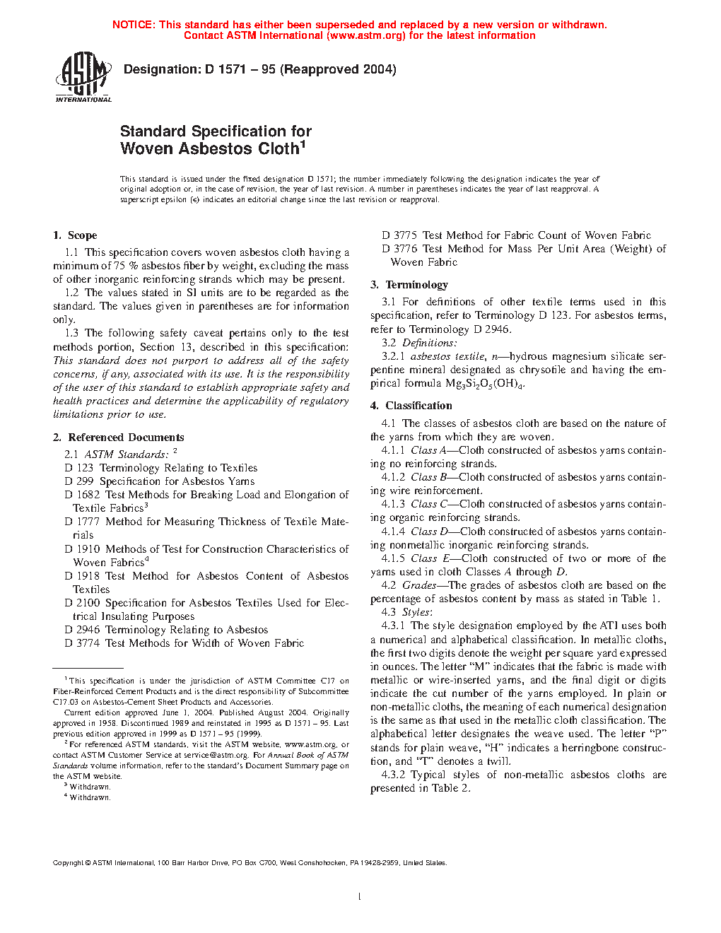 This specification covers woven asbestos cloth having a specified minimum weight % of asbestos fiber, excluding mass of other inorganic reinforcing strands which may be present. Asbestos cloths are classified into classes (Classes A, B, C, D, and E) according to the nature of the yarns from which they are woven, and into grades (Commercial, Underwriters', A, AA, AAA, and AAAA) according to the percentage of asbestos content by mass. Style designations are also given for both non-metallic and metallic (wire-inserted) asbestos cloths. Specimens shall be sampled, prepared, tested, and conform accordingly to specified physical (yarn and reinforcement type), electromagnetic (electrical insulation), mechanical (tensile or breaking strength), chemical (asbestos content), and dimensional property (width, thickness, mass per unit area or weight, fabric count, and yarn number) requirements.