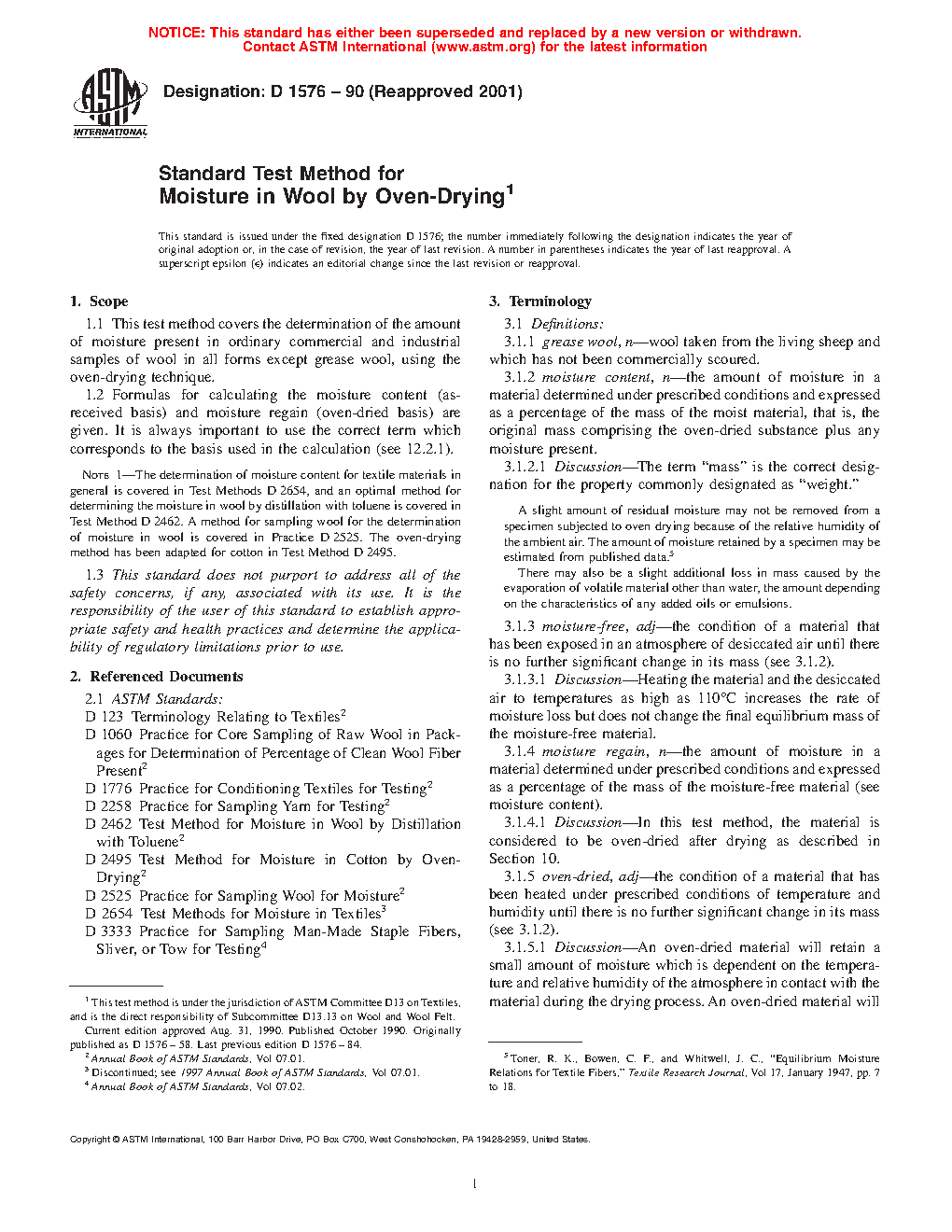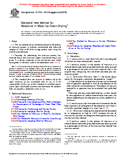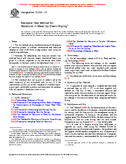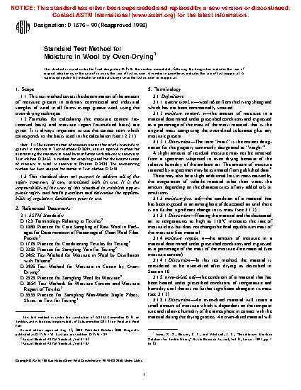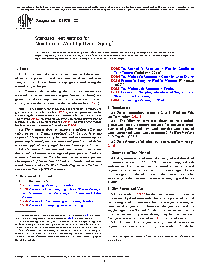 1.1 This test method covers the determination of the amount of moisture present in ordinary commercial and industrial samples of wool in all forms except grease wool, using the oven-drying technique.