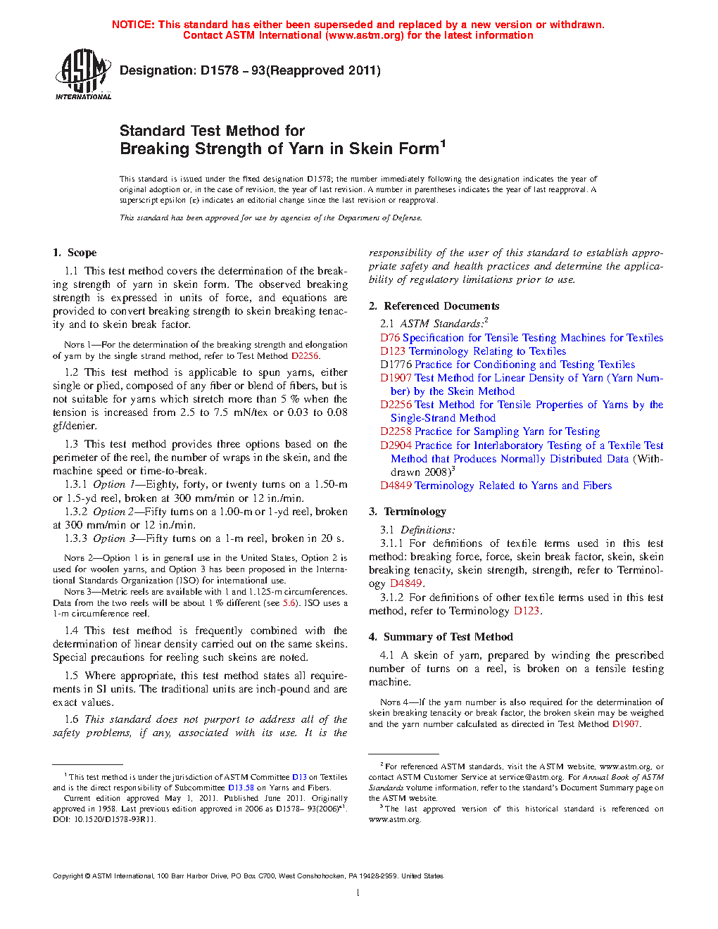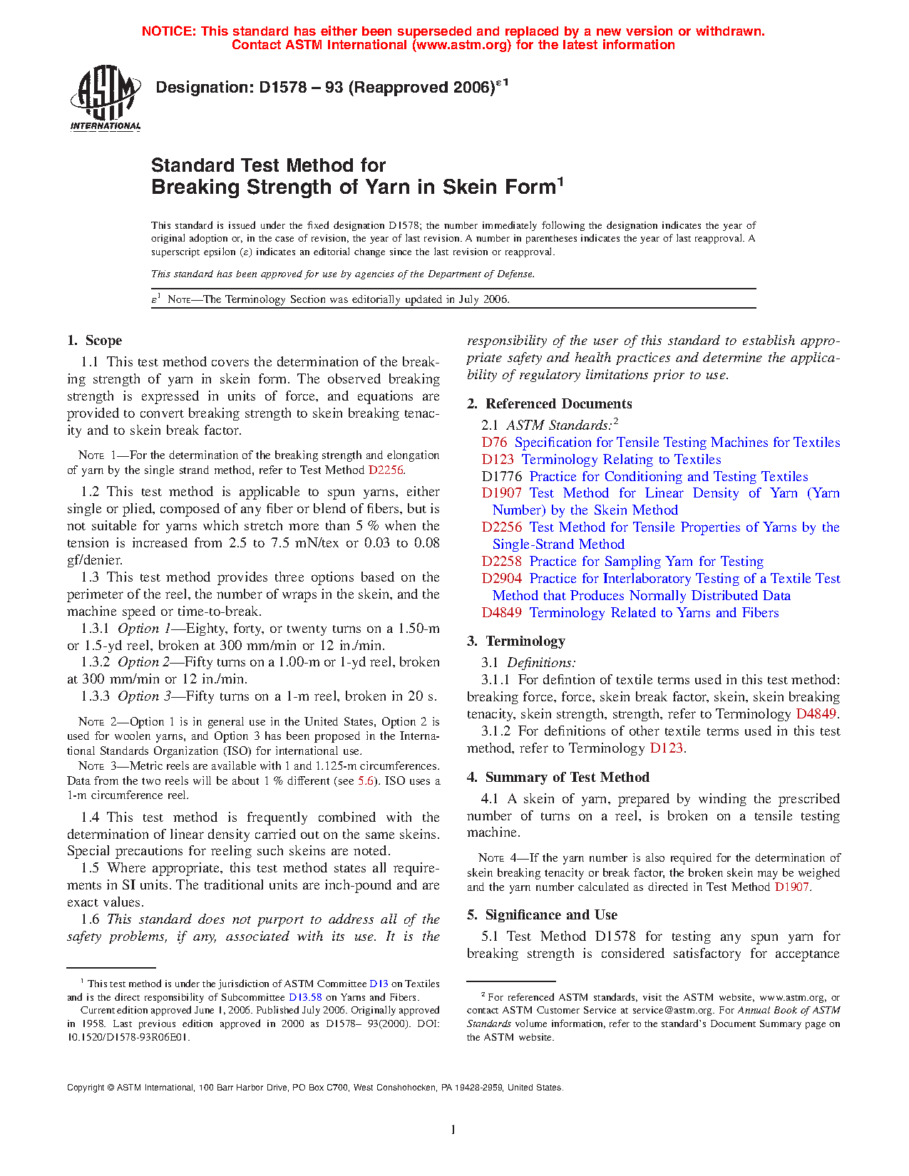5.1 Test Method D1578 for testing any spun yarn for breaking strength is considered satisfactory for acceptance testing of commercial shipments since the method has been used extensively in the trade.