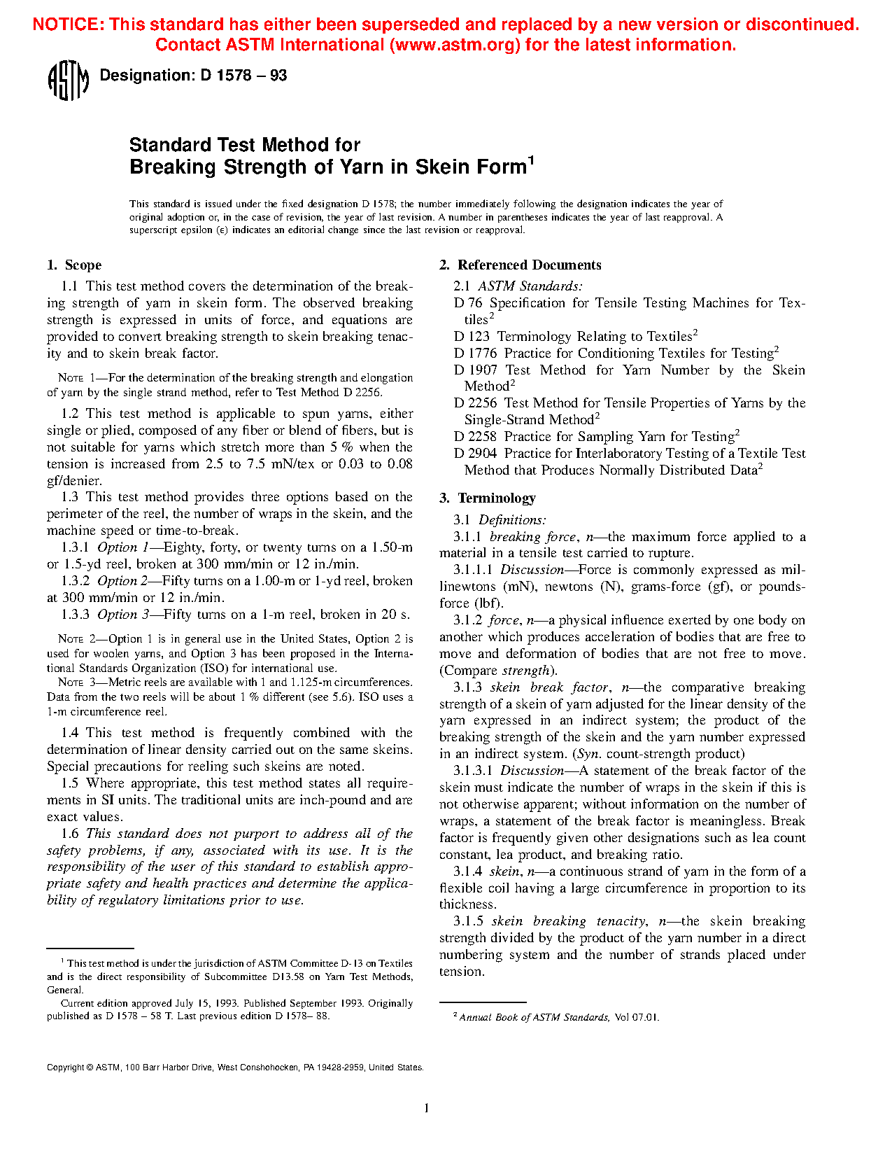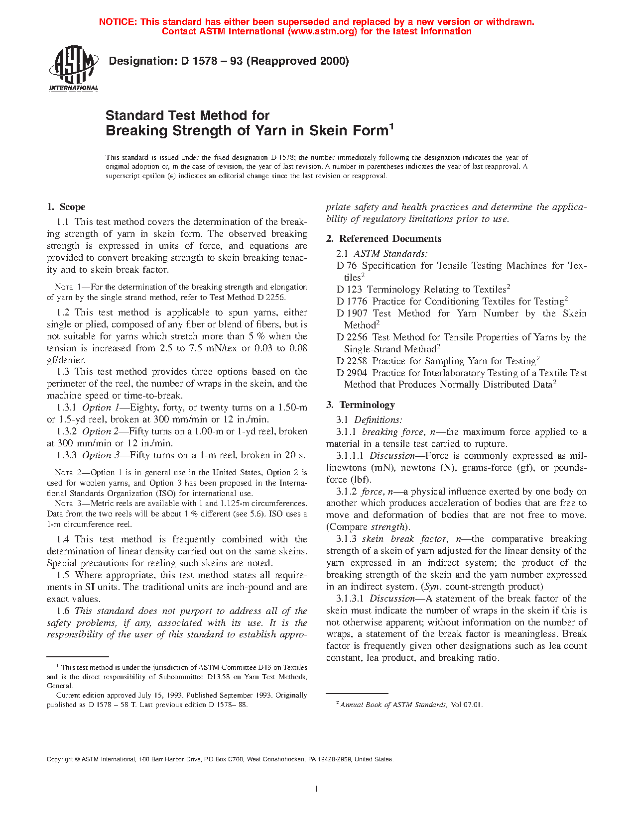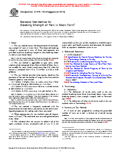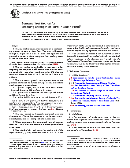 5.4 The circumference of the skeins used to determine the breaking load is not critical, and as a consequence, close control of the tension at which the skeins are wound is not necessary. If, however, the same skeins are to be used to determine yarn number for any purpose, the skeins must be reeled under controlled tension on a reel meeting the requirements given in Test Method D1907.