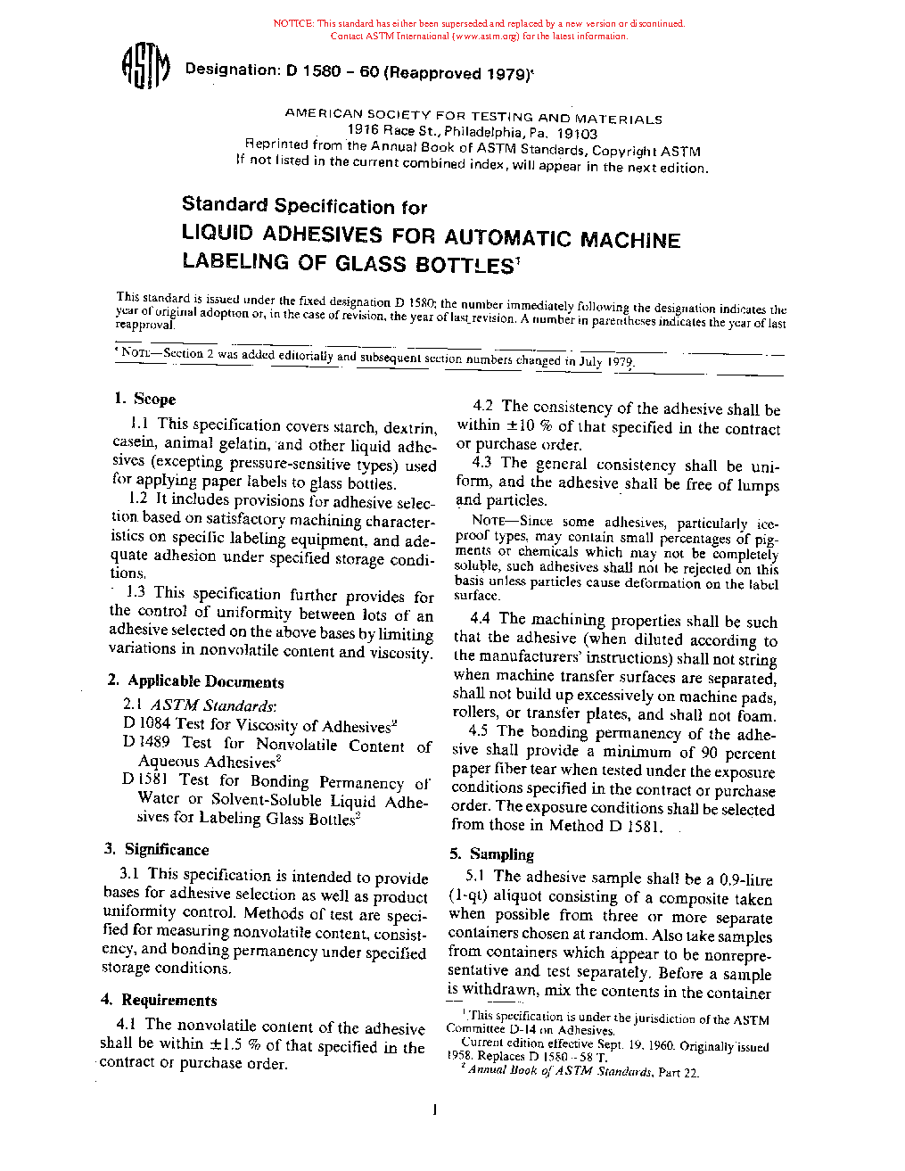 Specification for Liquid Adhesives for Automatic Machine Labeling of Glass Bottles