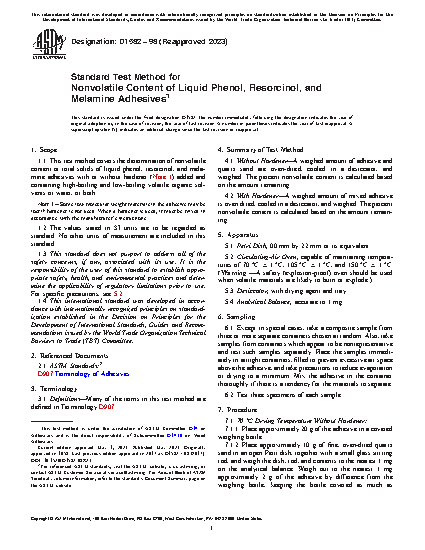 1.1 This test method covers the determination of nonvolatile content or total solids of liquid phenol, resorcinol, and melamine adhesives with or without hardener (Note 1) added and containing high-boiling and low-boiling volatile organic solvents or water, or both.