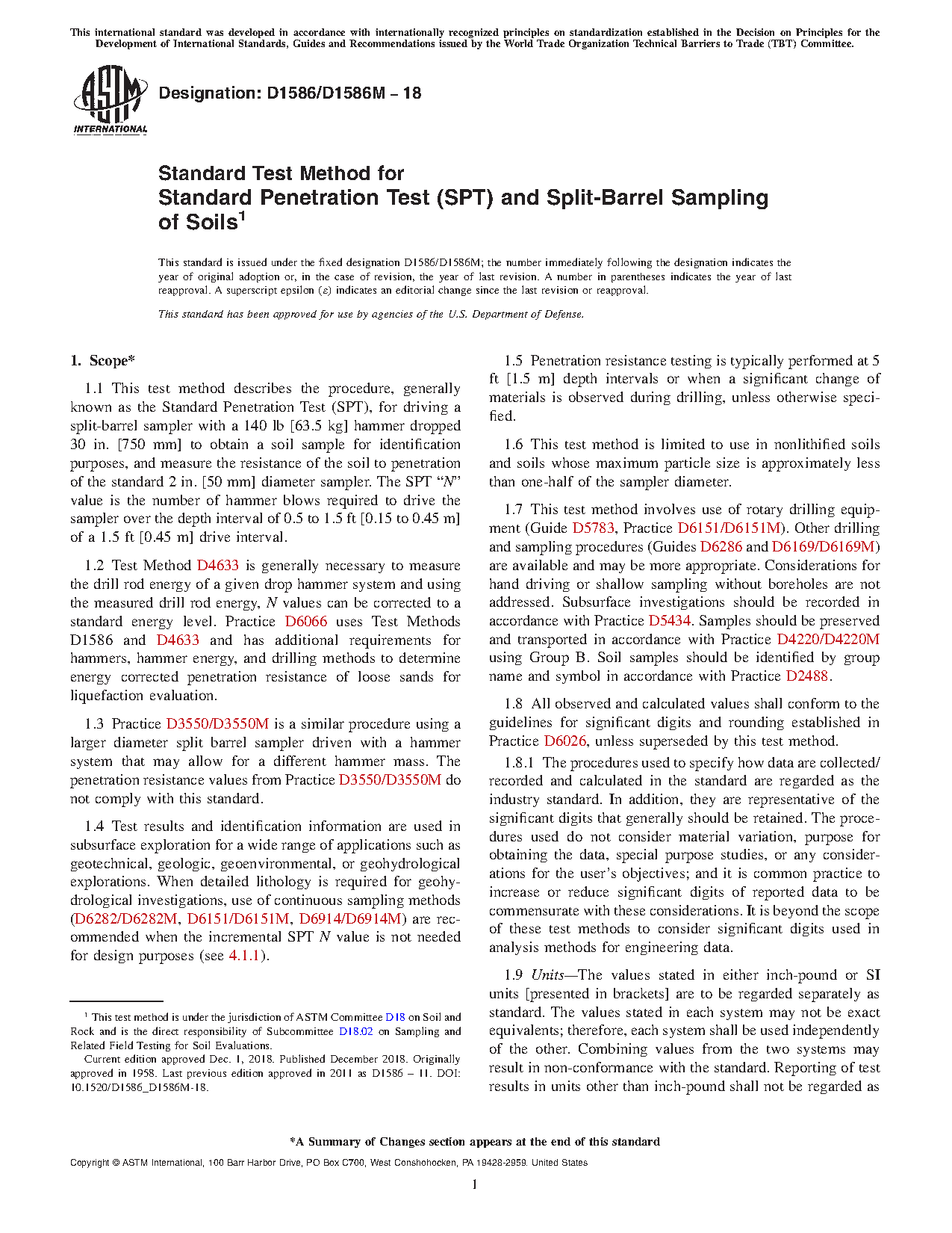 1.1 This test method describes the procedure, generally known as the Standard Penetration Test (SPT), for driving a split-barrel sampler with a 140 lb [63.5 kg] hammer dropped 30 in. [750 mm] to obtain a soil sample for identification purposes, and measure the resistance of the soil to penetration of the standard 2 in. [50 mm] diameter sampler. The SPT “N” value is the number of hammer blows required to drive the sampler over the depth interval of 0.5 to 1.5 ft [0.15 to 0.45 m] of a 1.5 ft [0.45 m] drive interval.