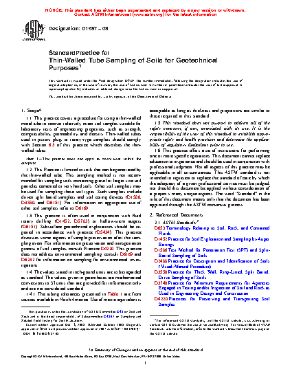 1.3 This practice is often used in conjunction with fluid rotary drilling (D1452, D5783) or hollow-stem augers (D6151). Subsurface geotechnical explorations should be reported in accordance with practice (D5434). This practice discusses some aspects of sample preservation after the sampling event. For information on preservation and transportation process of soil samples, consult Practice D4220. This practice does not address environmental sampling; consult D6169 and D6232 for information on sampling for environmental investigations.