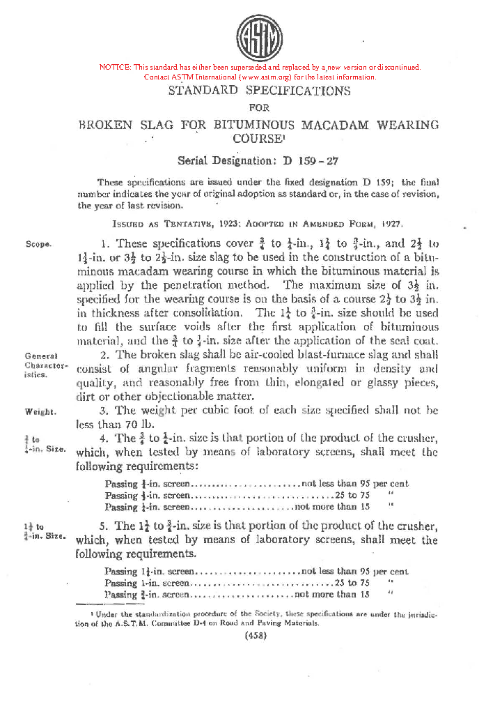 Specification for Crushed Stone and Crushed Slag for Bituminous Macadame Base and Surface Courses of Pavements (Withdrawn 1938)