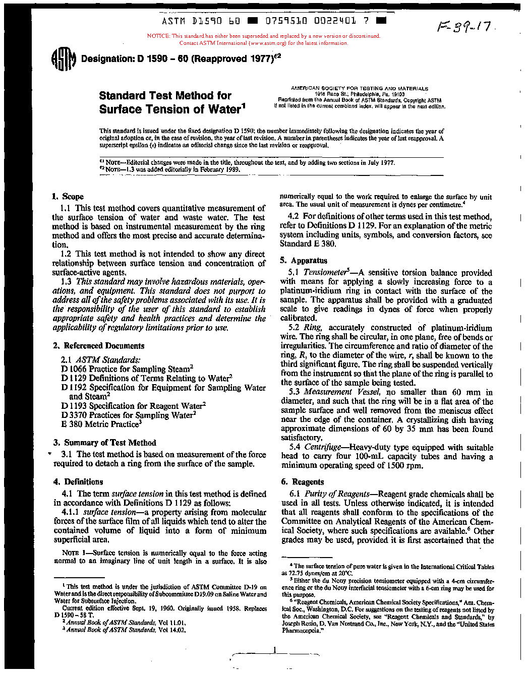Test Methods for Surface Tension of Water and Waste Water