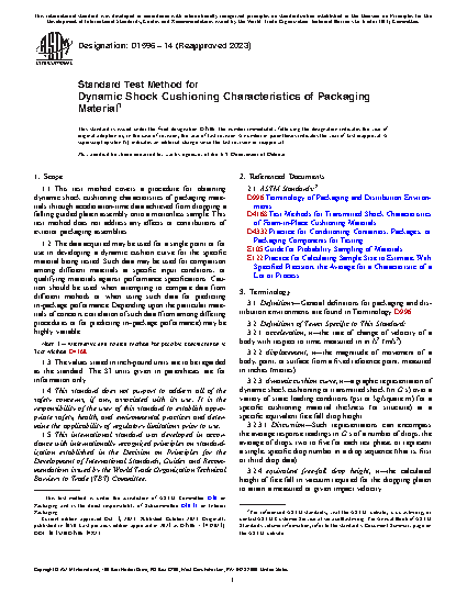 1.1 This test method covers a procedure for obtaining dynamic shock cushioning characteristics of packaging materials through acceleration-time data achieved from dropping a falling guided platen assembly onto a motionless sample. This test method does not address any effects or contributions of exterior packaging assemblies.