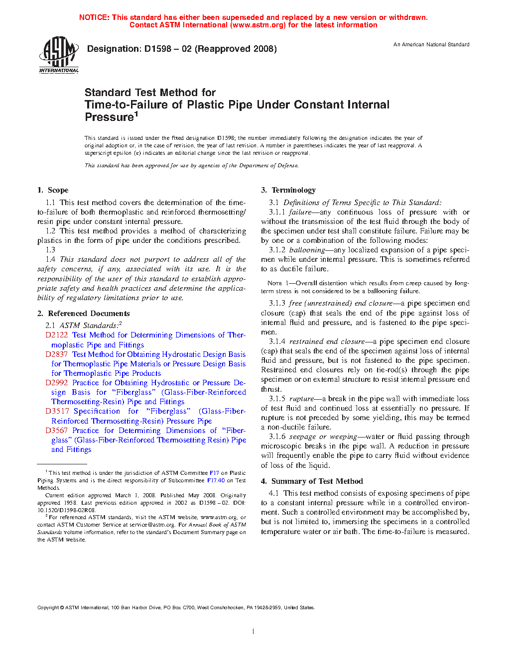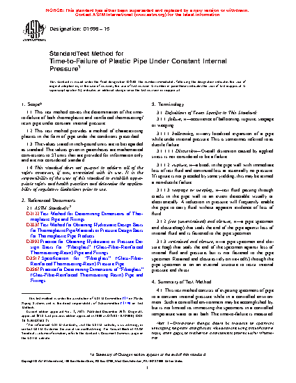 1.1 This test method covers the determination of the time-to-failure of both thermoplastic and reinforced thermosetting/resin pipe under constant internal pressure.