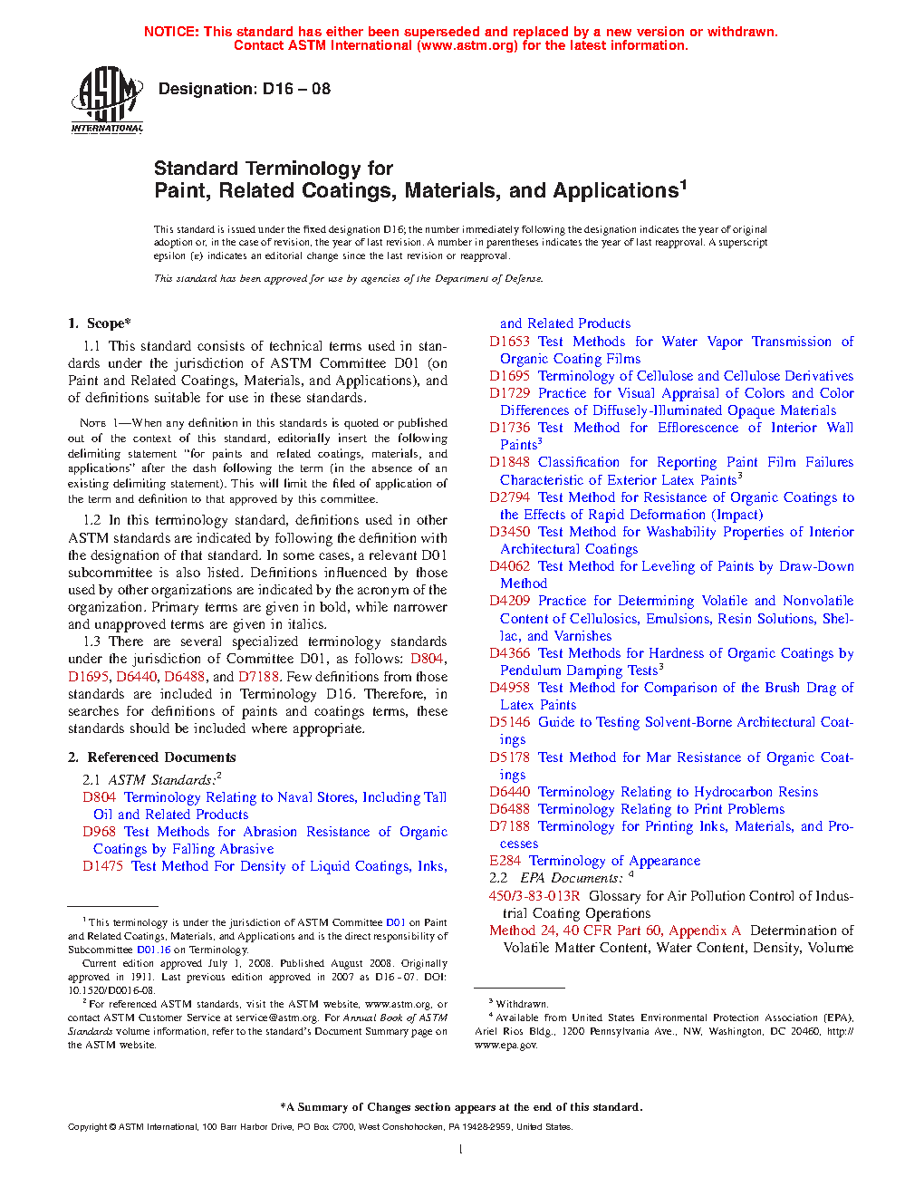 1.3 There are several specialized terminology standards under the jurisdiction of Committee D01, as follows: D804, D1695, D6440, D6488, and D7188. Few definitions from those standards are included in Terminology D16. Therefore, in searches for definitions of paints and coatings terms, these standards should be included where appropriate.