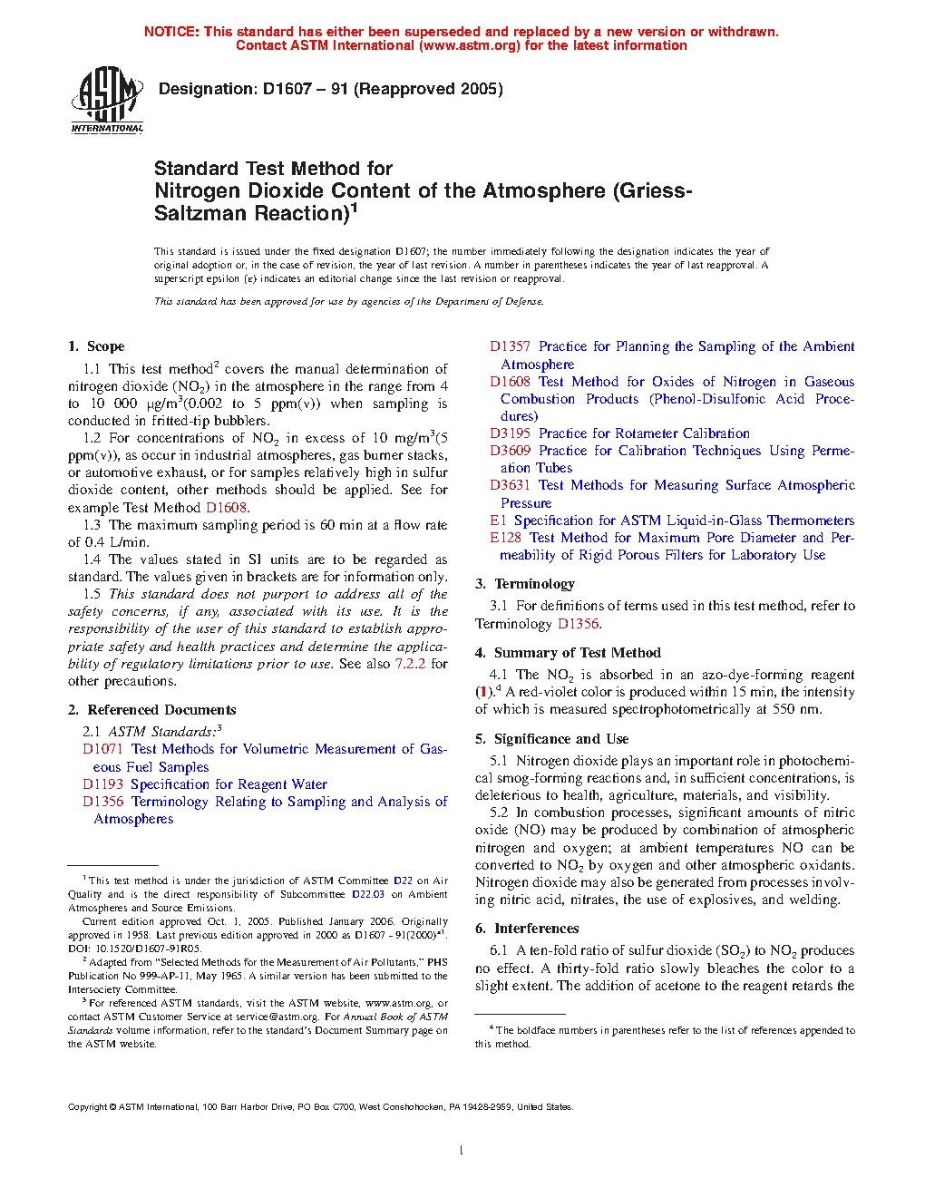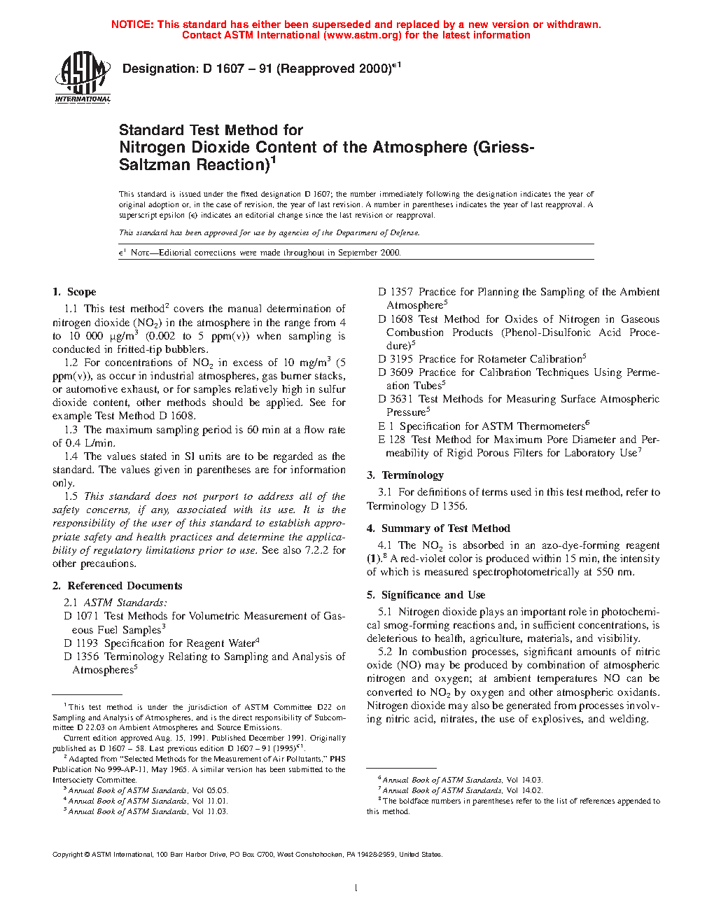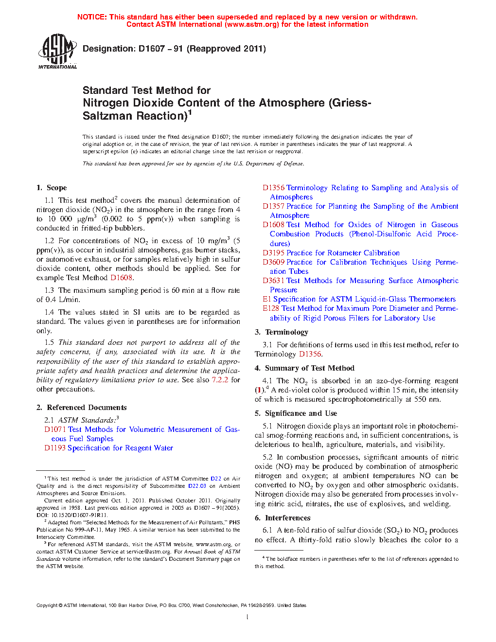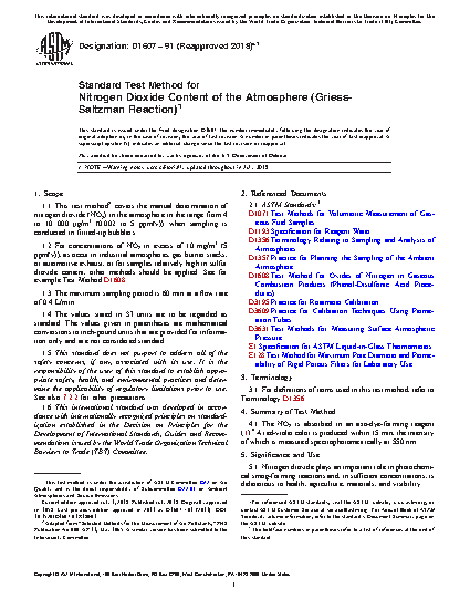 1.1 This test method2 covers the manual determination of nitrogen dioxide (NO2) in the atmosphere in the range from 4 µg/m3 to 10 000 µg/m3 (0.002 ppm(v) to 5 ppm(v)) when sampling is conducted in fritted-tip bubblers.