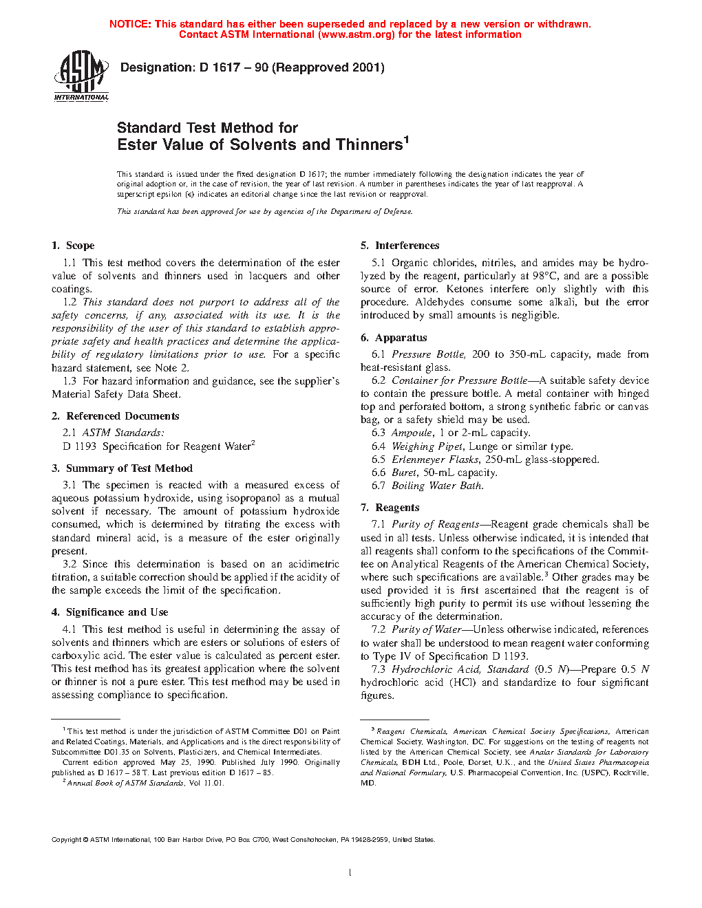 4.1 This test method is useful in determining the assay of solvents and thinners which are esters or solutions of esters of carboxylic acid. The ester value is calculated as percent ester. This test method has its greatest application where the solvent or thinner is not a pure ester. This test method may be used in assessing compliance to specification.