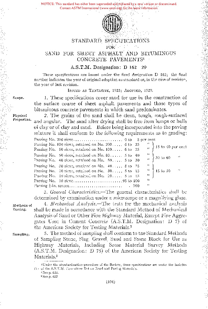 Specification for Fine Aggregate for Sheet Asphalt and Bituminous Concrete Pavements (Withdrawn 1949)
