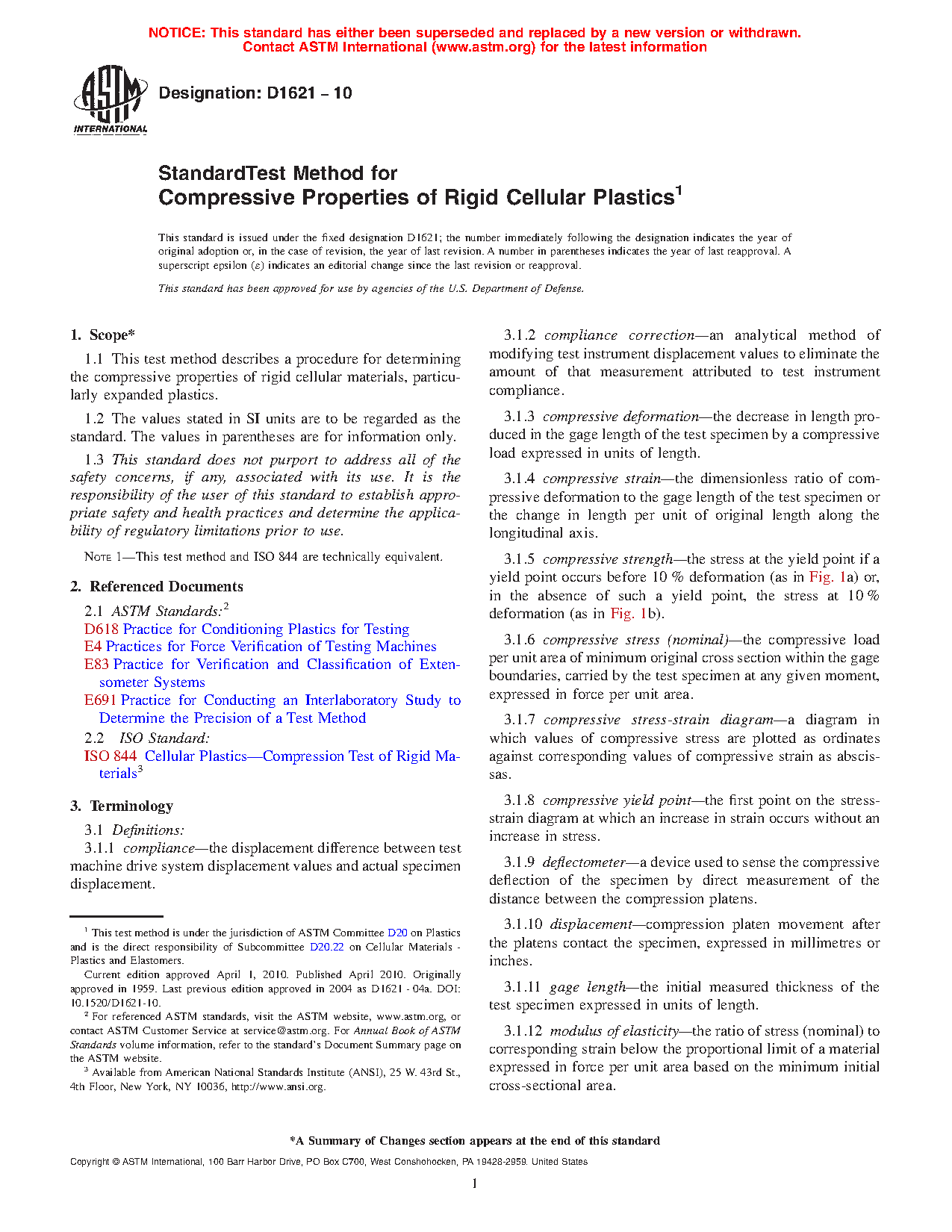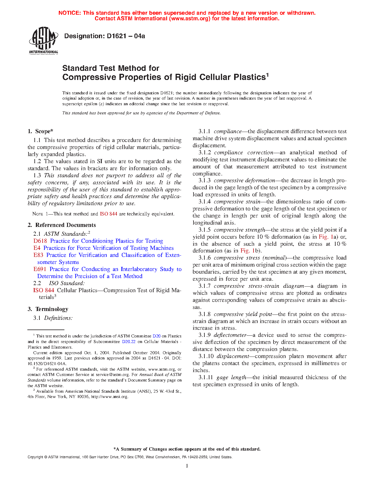 1.1 This test method describes a procedure for determining the compressive properties of rigid cellular materials, particularly expanded plastics.