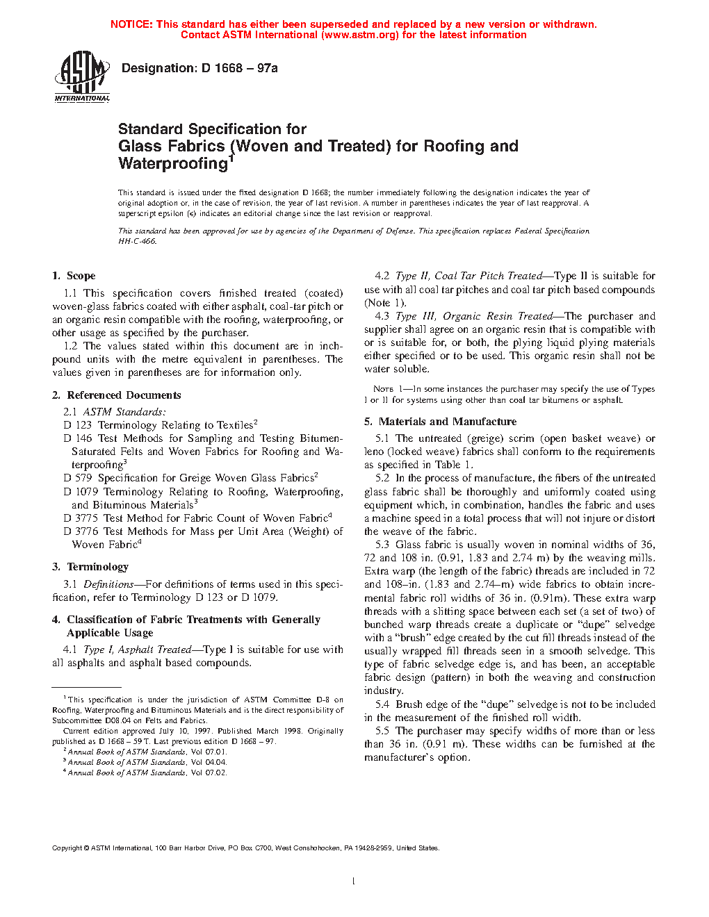 1.1 This specification covers finished treated (coated) woven-glass fabrics coated with either asphalt, coal-tar pitch or an organic resin compatible with the roofing, waterproofing, or other usage as specified by the purchaser.