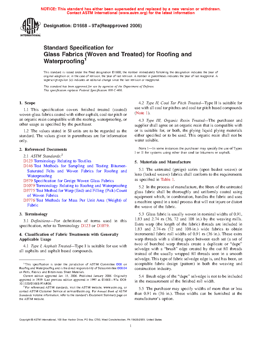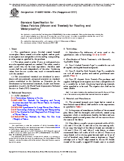 1.1 This specification covers finished treated (coated) woven-glass fabrics coated with either asphalt, coal-tar pitch or an organic resin compatible with the roofing, waterproofing, or other usage as specified by the purchaser.
