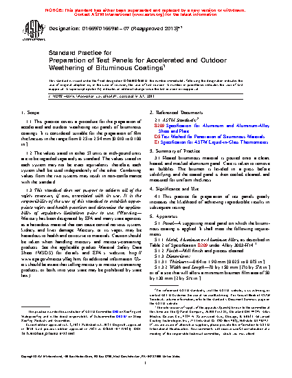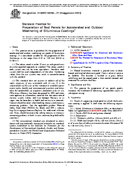 1.1 This practice covers a procedure for the preparation of accelerated and outdoor weathering test panels of bituminous coatings. It is considered suitable for the preparation of film thicknesses in the range from 0.25 to 2.54 mm [0.010 to 0.100 in.].
