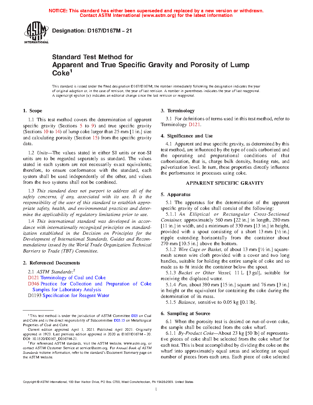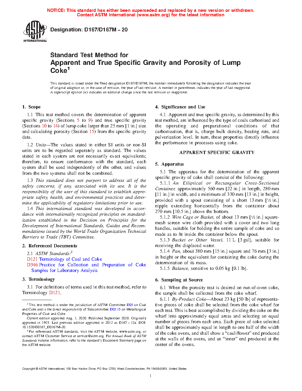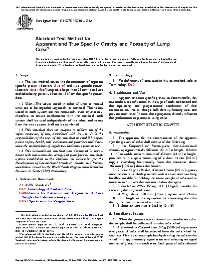 1.1 This test method covers the determination of apparent specific gravity (Sections 5 to 9) and true specific gravity (Sections 10 to 14) of lump coke larger than 25 mm [1 in.] size and calculating porosity (Section 15) from the specific gravity data.