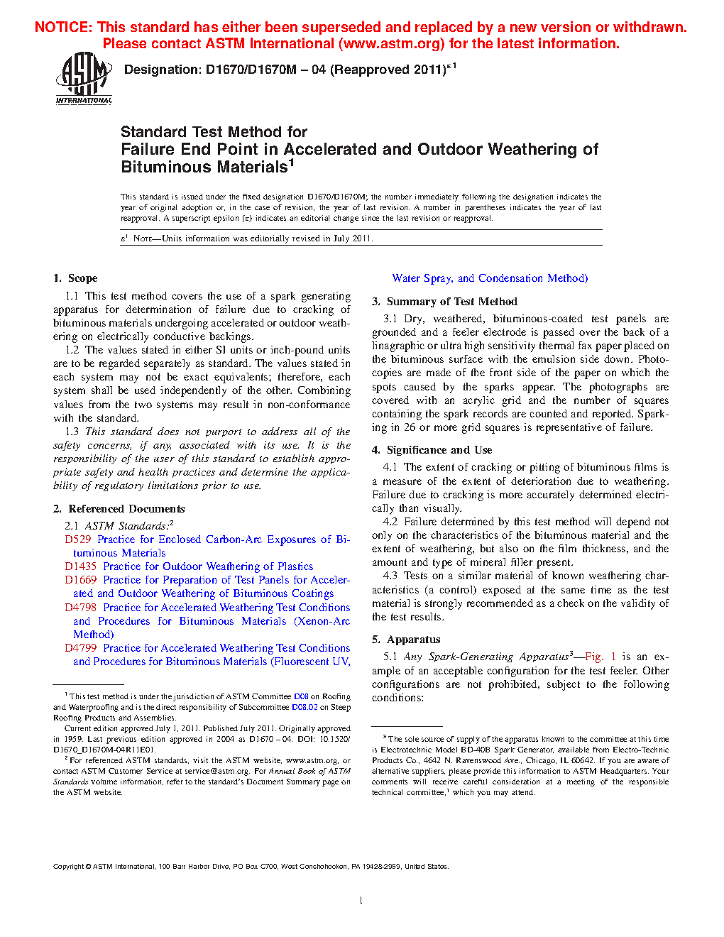 1.1 This test method covers the use of a spark generating apparatus for determination of failure due to cracking of bituminous materials undergoing accelerated or outdoor weathering on electrically conductive backings.