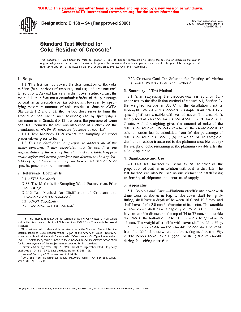 1.1 This test method covers the determination of the coke residue (fixed carbon) of creosote, coal tar, and creosote-coal tar solutions. As coal tars vary in their coke residue values, the method is therefore not a quantitative index of the percentage of coal tar in creosote-coal tar solutions. However, by specifying maximum amounts of coke residue as done in AWPA Standards P2 and P12, the method does serve to limit the amount of coal tar in such solutions; and by specifying a minimum as in Standard P12 it ensures the presence of some coal tar. Formerly the test was also used as a check on the cleanliness of AWPA P1 creosote (absence of coal tar).