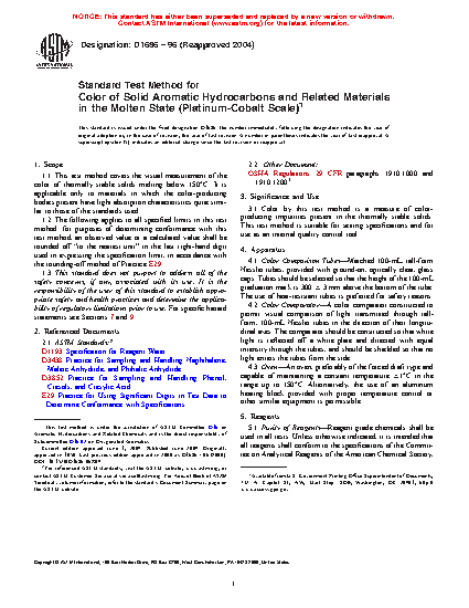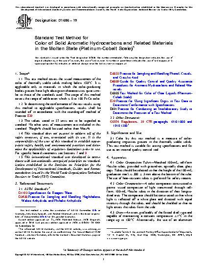 1.1 This test method covers the visual measurement of the color of thermally stable solids melting below 150°C. It is applicable only to materials in which the color-producing bodies present have light absorption characteristics quite similar to those of the standards used. The scope of this method covers the range of calibration which is 0 to 100 Pt-Co color.