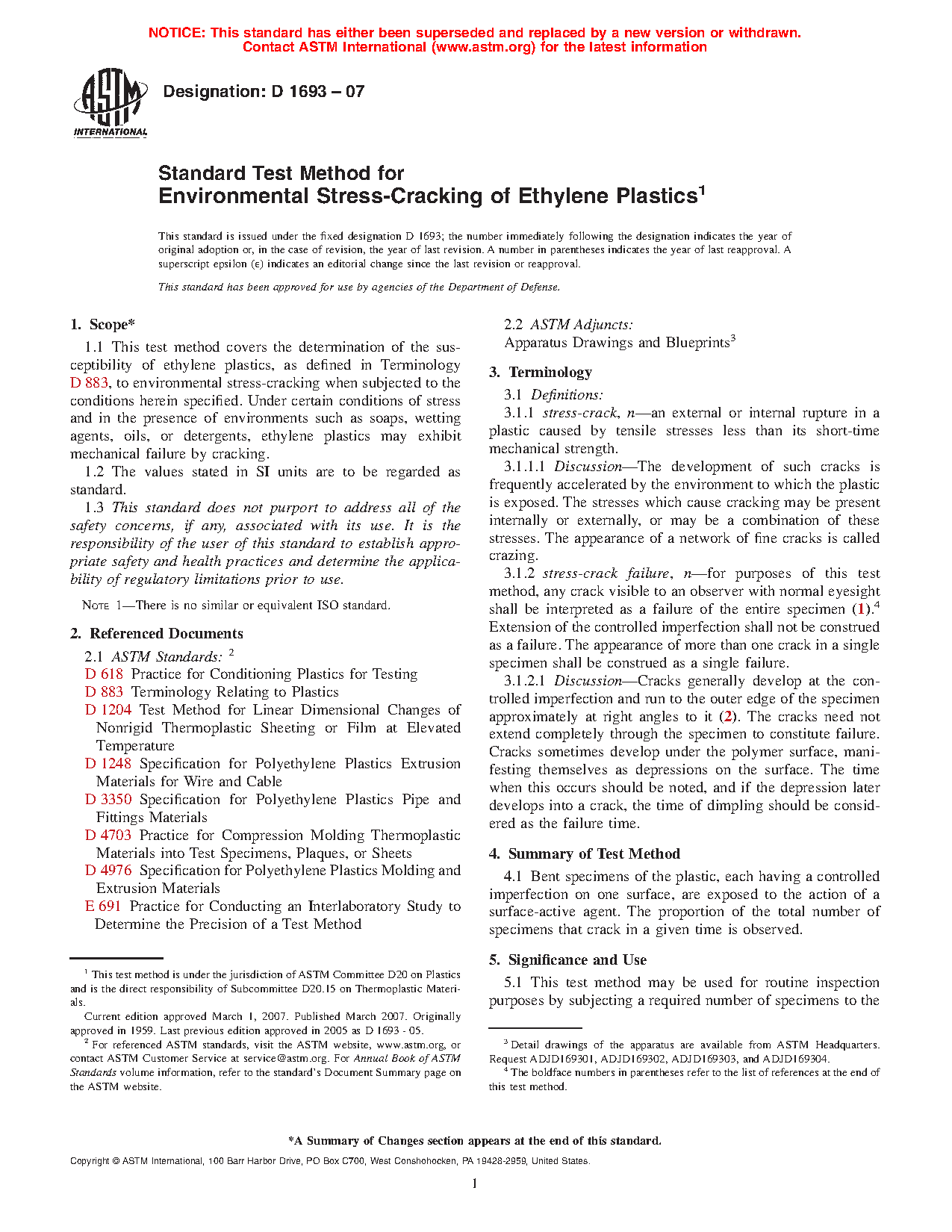1.1 This test method covers the determination of the susceptibility of ethylene plastics, as defined in Terminology D883, to environmental stress-cracking when subjected to the conditions herein specified. Under certain conditions of stress and in the presence of environments such as soaps, wetting agents, oils, or detergents, ethylene plastics may exhibit mechanical failure by cracking.