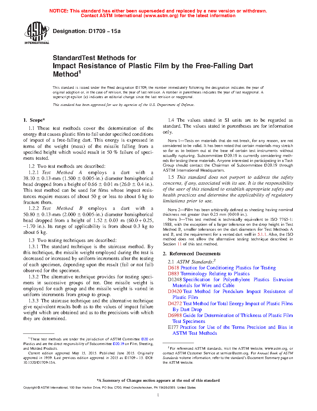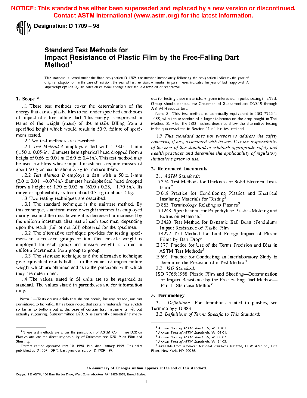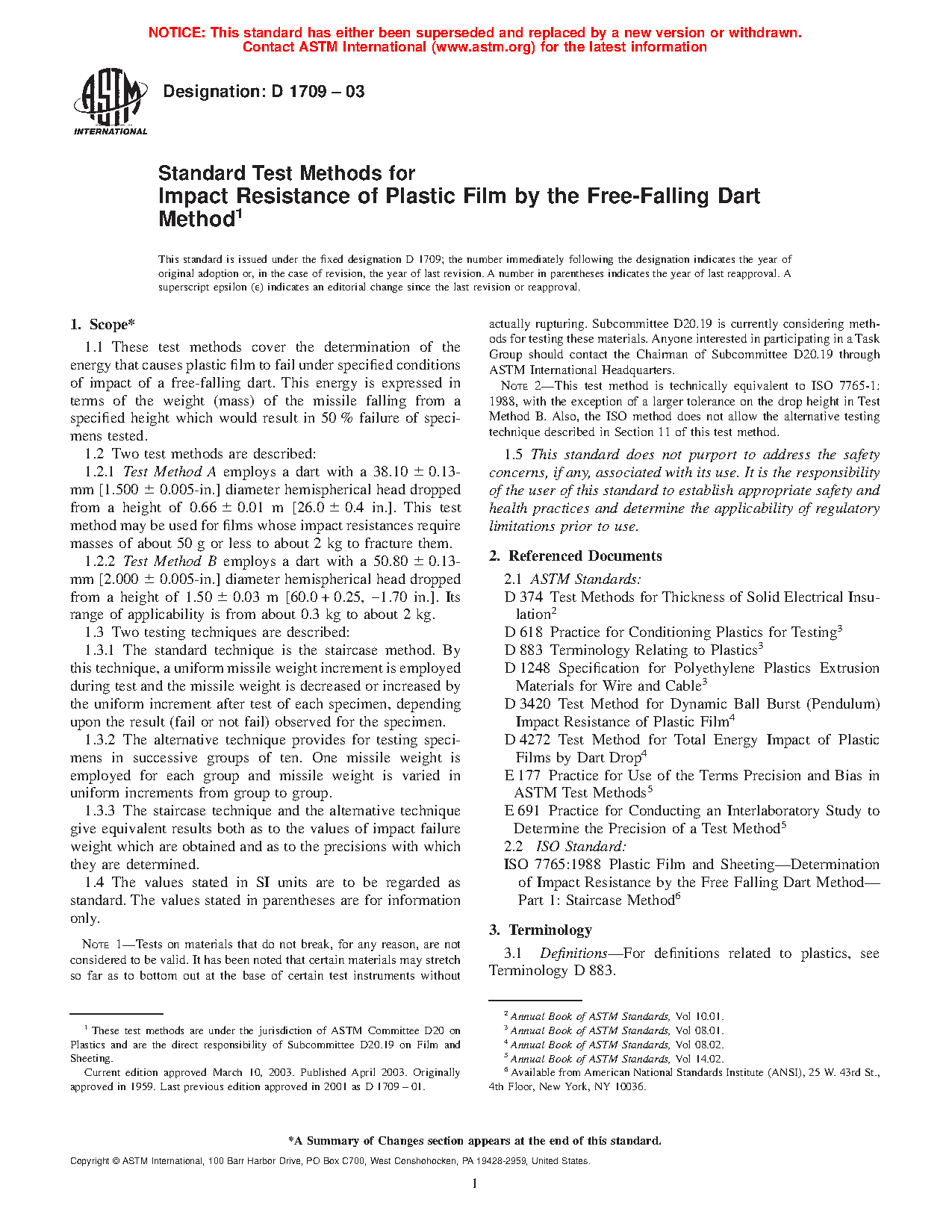 Note 3: This test method is technically equivalent to ISO 7765-1:1988, with the exception of a larger tolerance on the drop height in Test Method B, smaller tolerances on the dart diameters for Test Methods A and B, and the requirement for a vented dart well in 5.1.1. Also, the ISO method does not allow the alternative testing technique described in Section 11 of this test method.