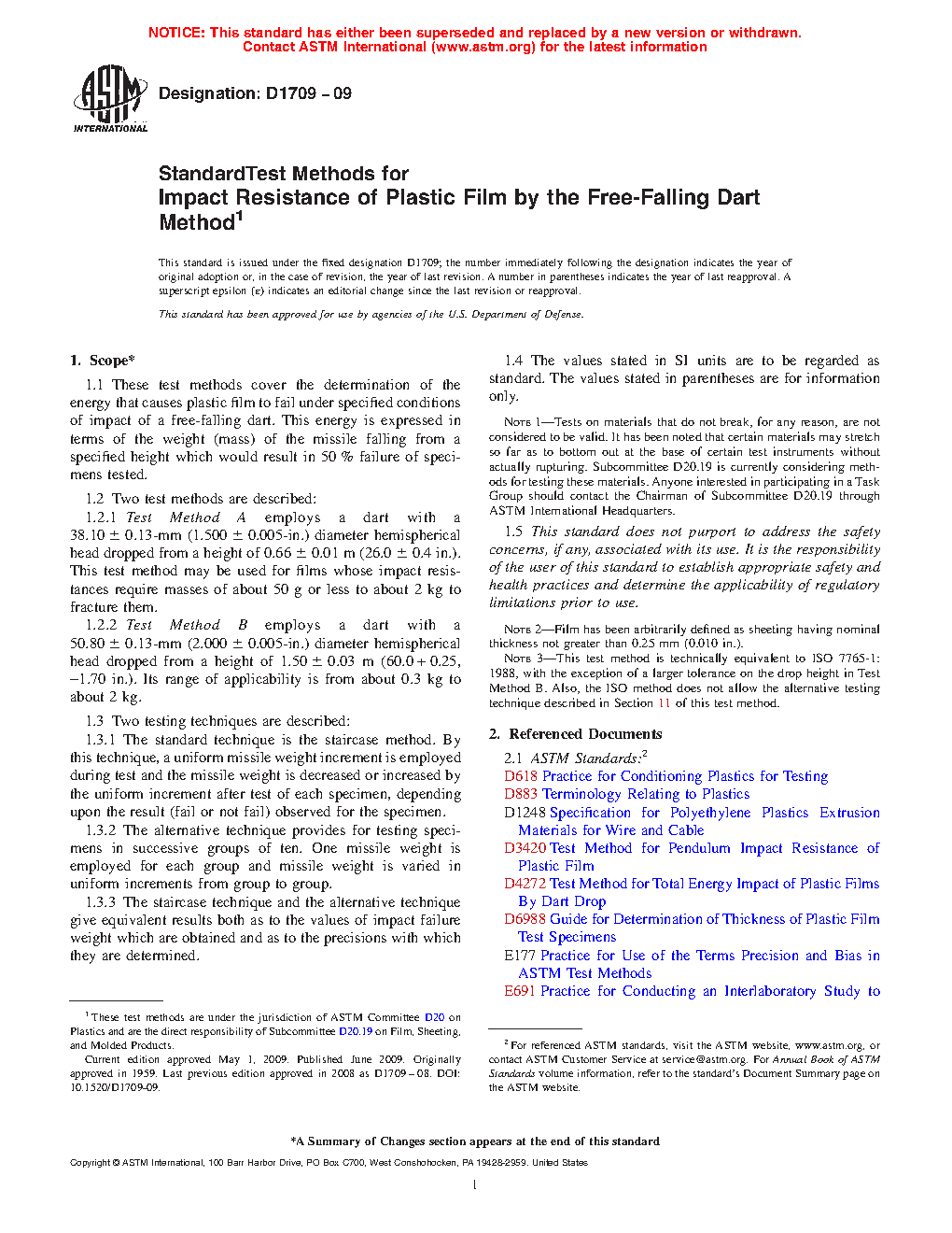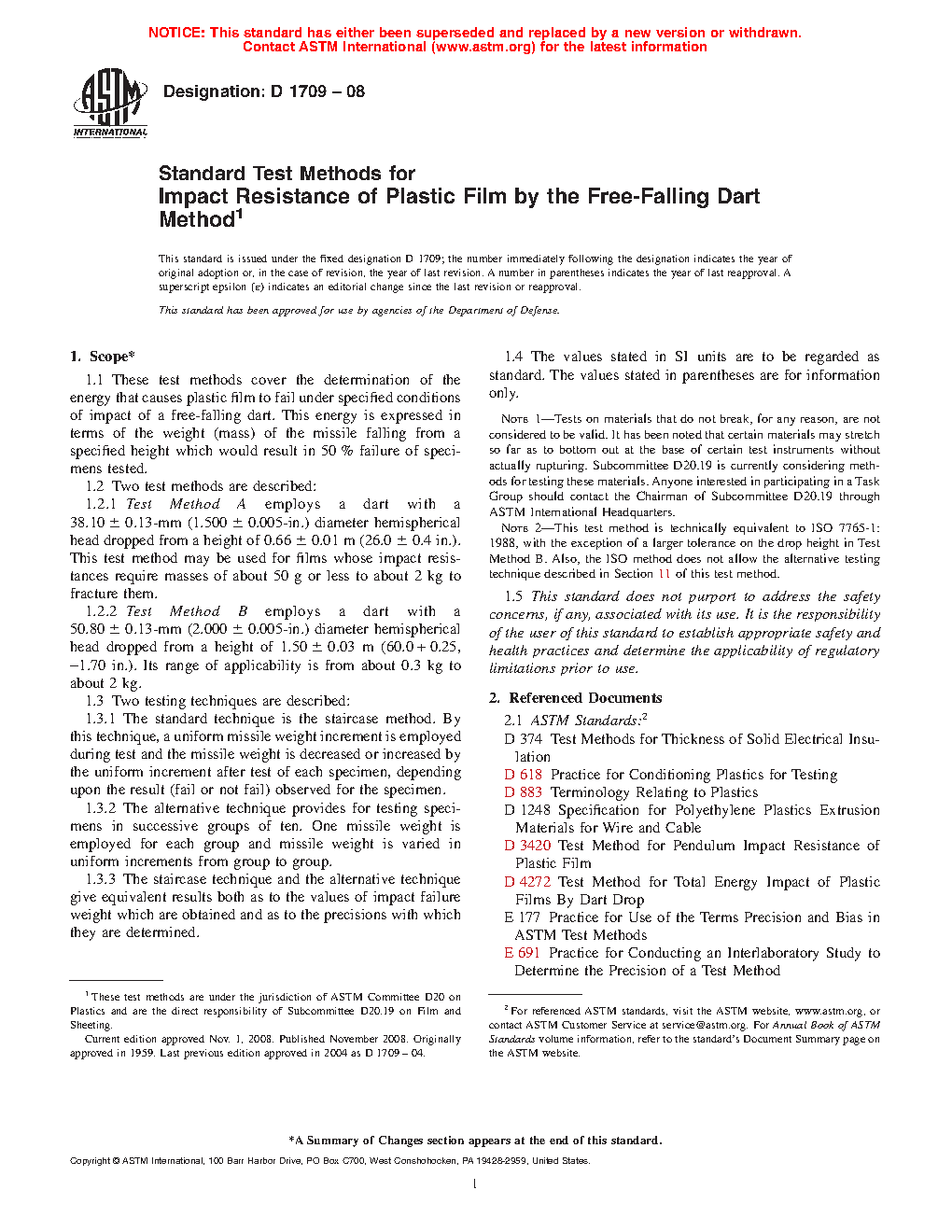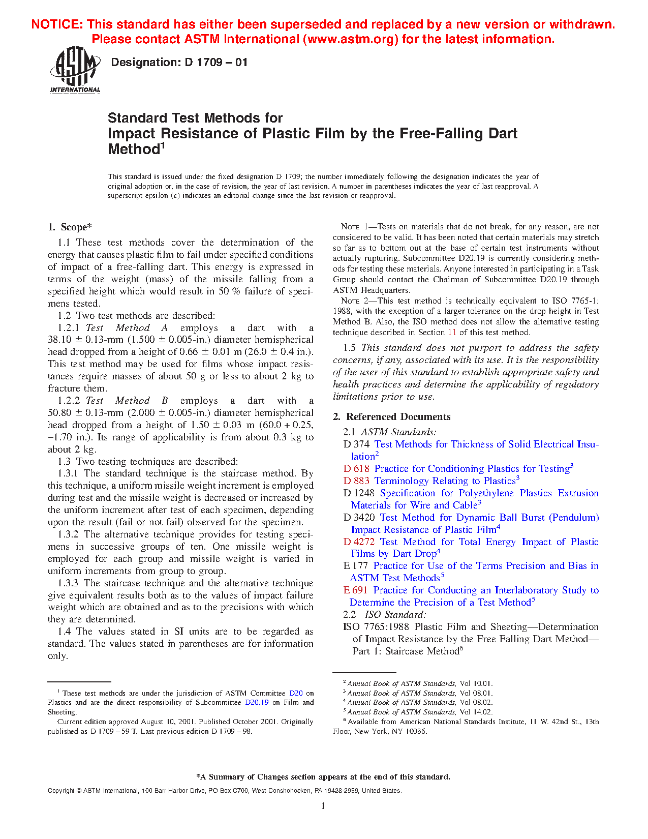 Note 3: This test method is technically equivalent to ISO 7765-1:1988, with the exception of a larger tolerance on the drop height in Test Method B, smaller tolerances on the dart diameters for Test Methods A and B, and the requirement for a vented dart well in 5.1.1. Also, the ISO method does not allow the alternative testing technique described in Section 11 of this test method.