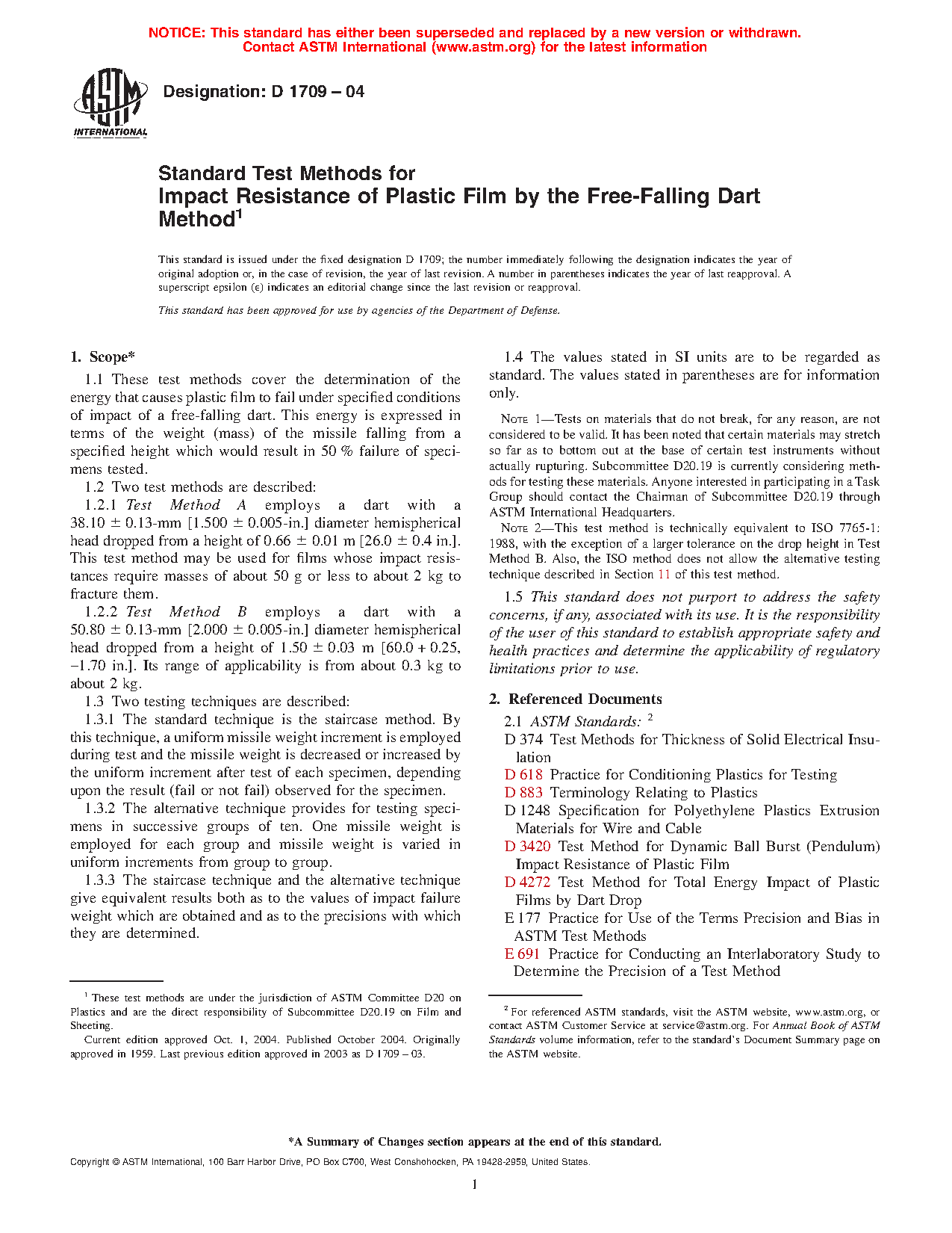 1.1 These test methods cover the determination of the energy that causes plastic film to fail under specified conditions of impact of a free-falling dart. This energy is expressed in terms of the weight (mass) of the missile falling from a specified height which would result in 50 % failure of specimens tested.