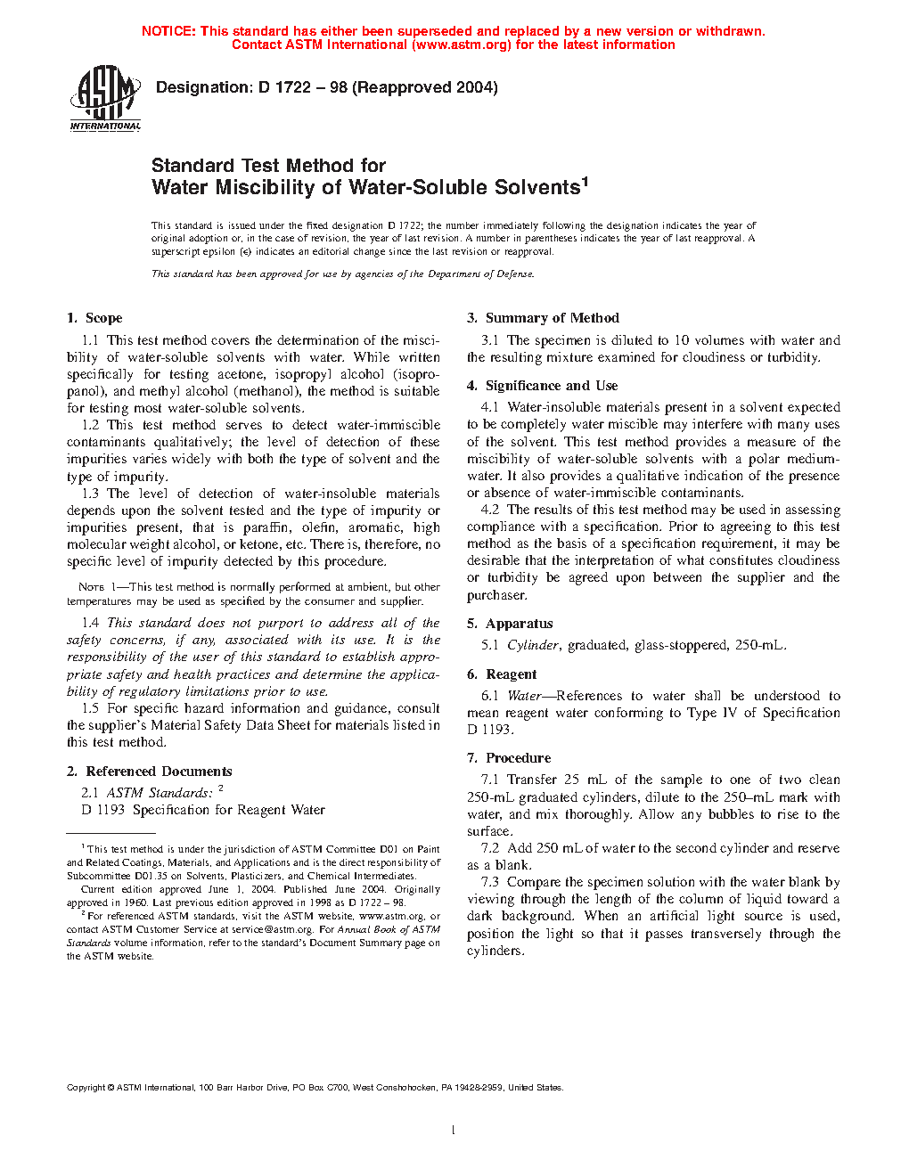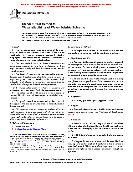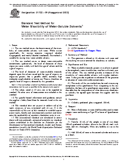 1.1 This test method covers the determination of the miscibility of water-soluble solvents with water. While written specifically for testing acetone, isopropyl alcohol (isopropanol), and methyl alcohol (methanol), the method is suitable for testing most water-soluble solvents.