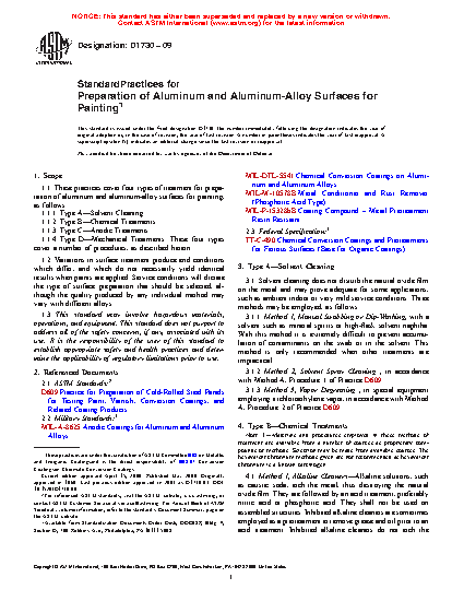 1.1 These practices cover four types of treatment for preparation of aluminum and aluminum-alloy surfaces for painting, as follows: