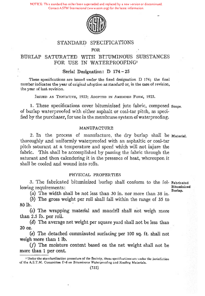 Specification for Burlap Saturated with Bituminous Substances for Use in Waterproofing (Withdrawn 1938)