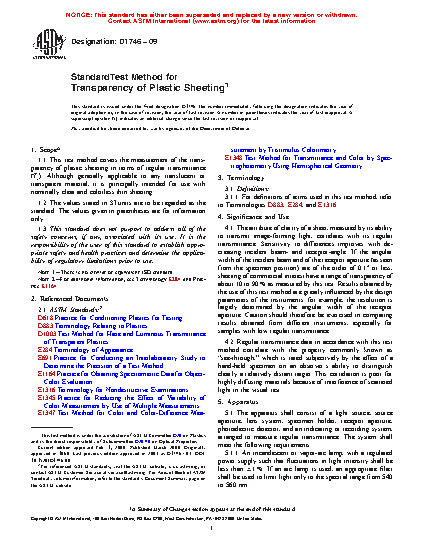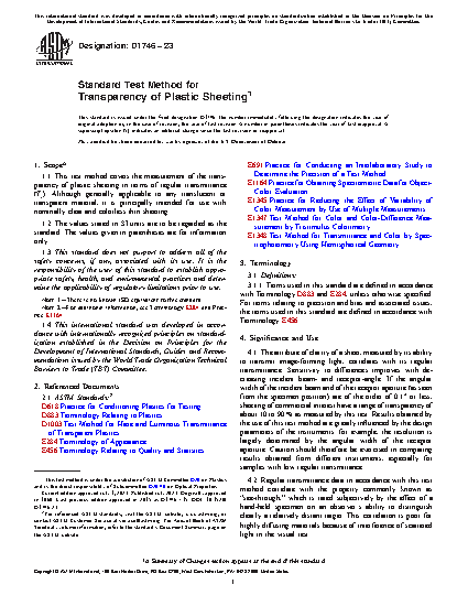 1.1 This test method covers the measurement of the transparency of plastic sheeting in terms of regular transmittance (Tr). Although generally applicable to any translucent or transparent material, it is principally intended for use with nominally clear and colorless thin sheeting.