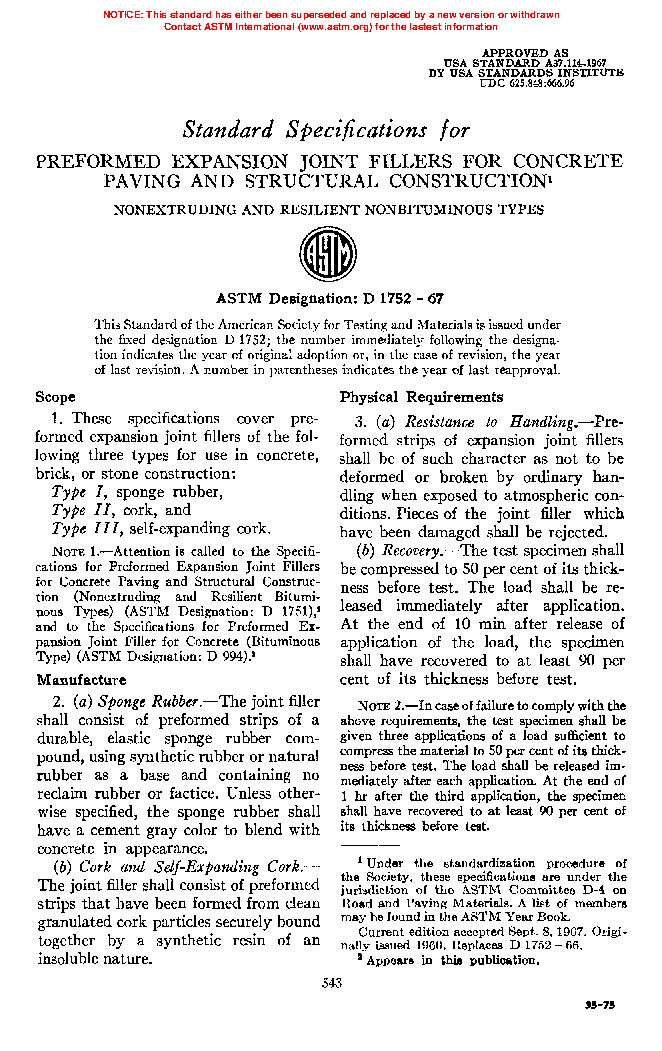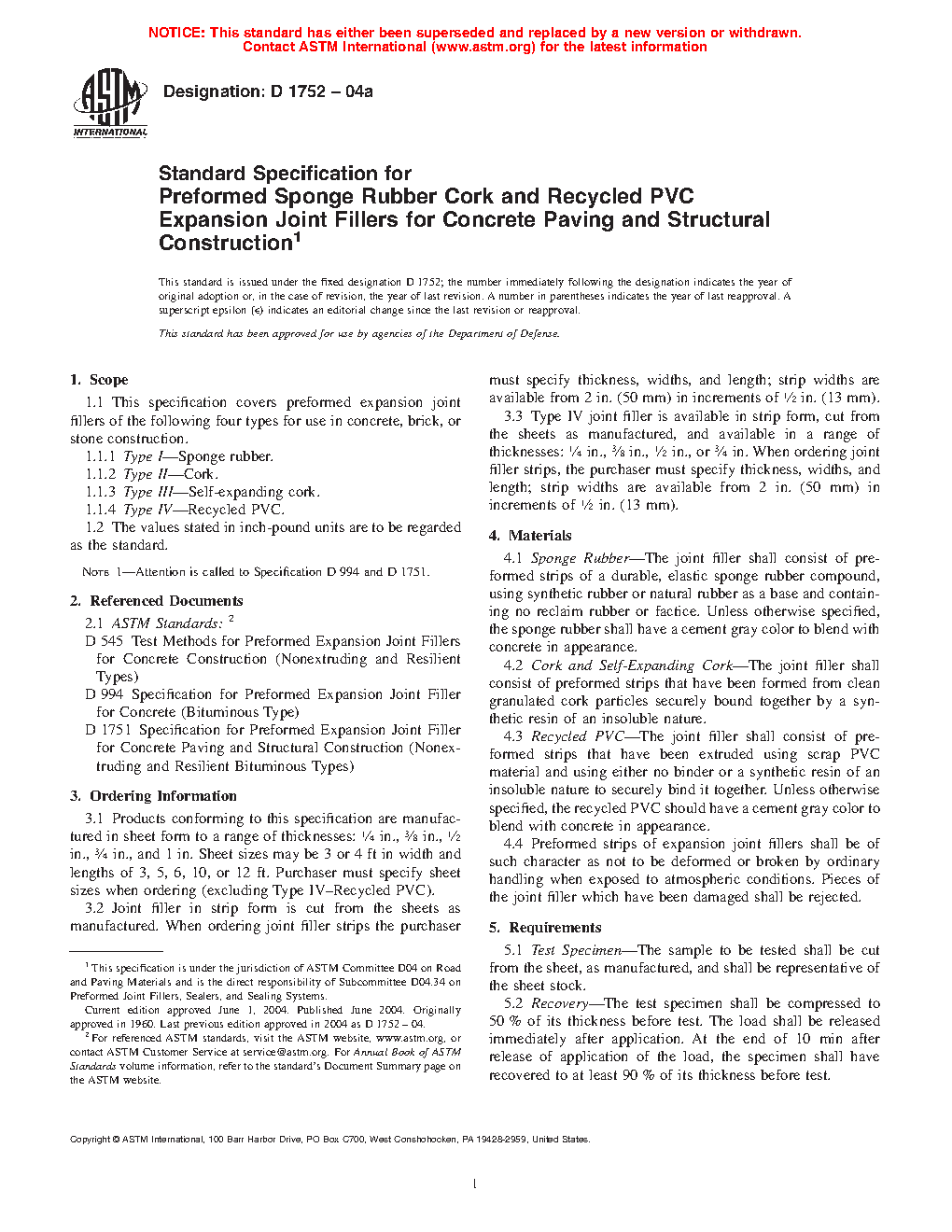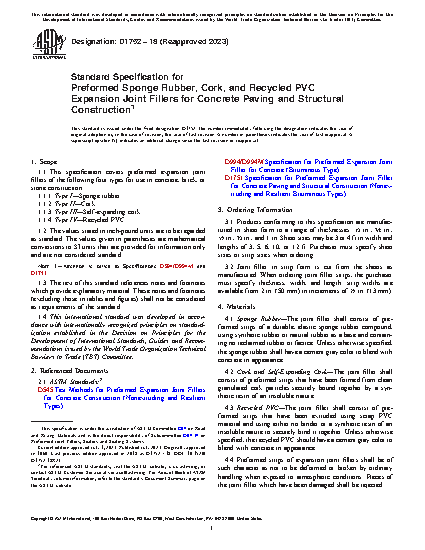 This specification covers preformed expansion joint fillers for use in concrete, brick, stone, and other paving and structural construction. The fillers are available in the following types: Type I, sponge rubber, which shall consist of preformed strips of a durable elastic sponge rubber compound using synthetic rubber or natural rubber as a base and containing no reclaim rubber or factice; Type II, cork, and Type III, self-expanding cork, which shall both consist of preformed strips that have been formed from clean granulated cork particles securely bound together by a synthetic resin of an incoluble nature; and Type IV, recycled PVC, which shall consist of preformed strips that have been extruded using scrap PVC material and using either no binder or a synthetic resin of an insoluble nature to securely bind it together. Materials shall be sampled suitably according to specified size and number, and shall meet property requirements as to recovery, compression, extrusion, expansion, boiling in hydrochloric acid, and density.