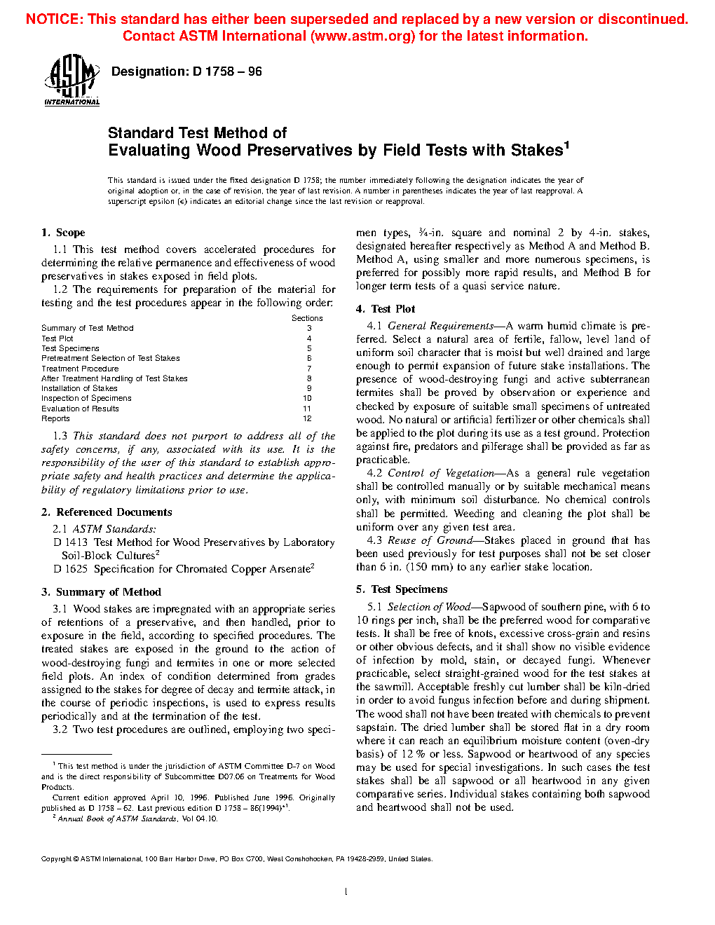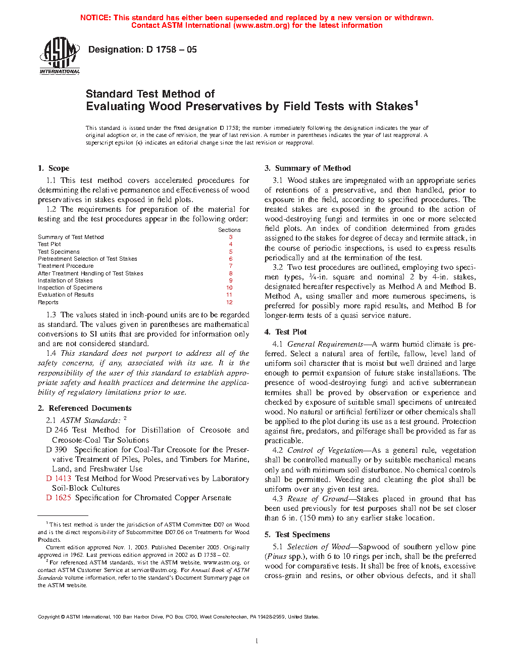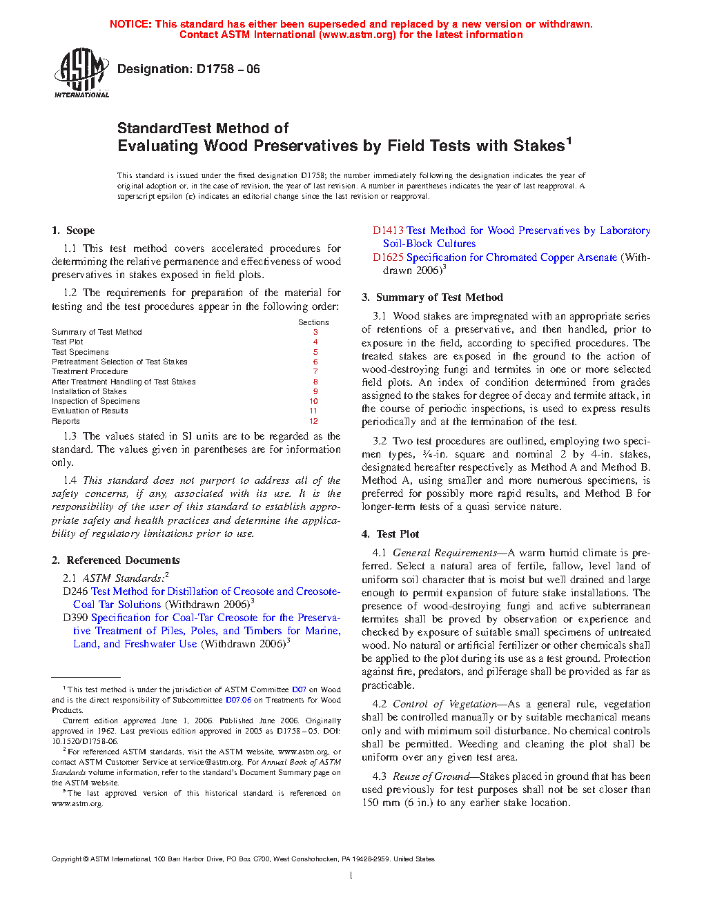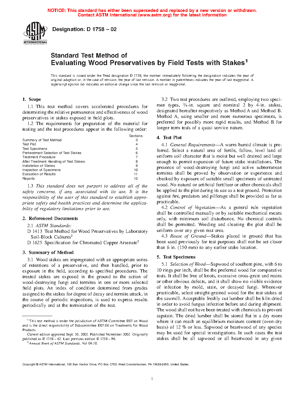 1.1 This test method covers accelerated procedures for determining the relative permanence and effectiveness of wood preservatives in stakes exposed in field plots.