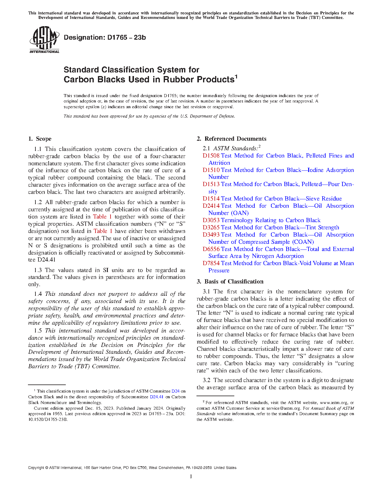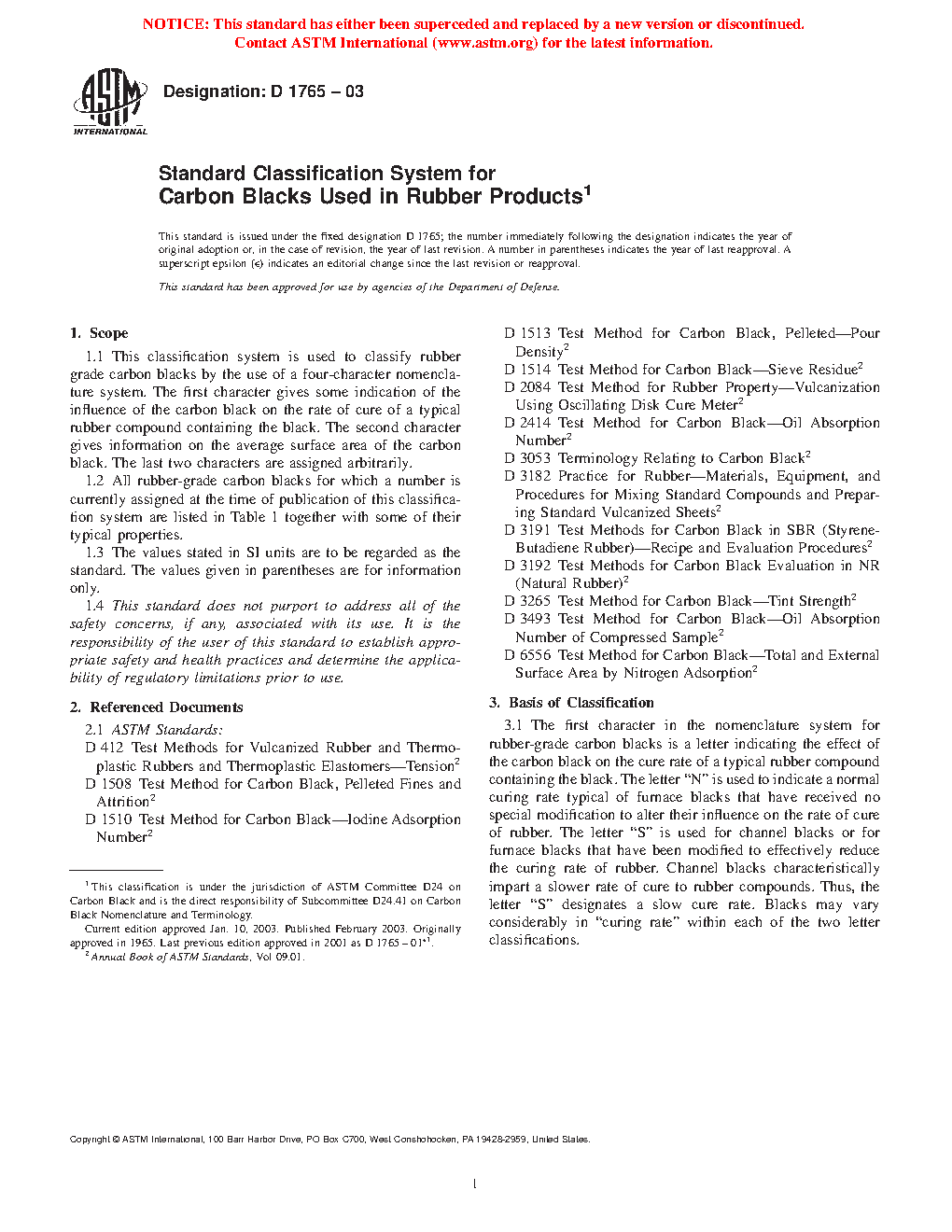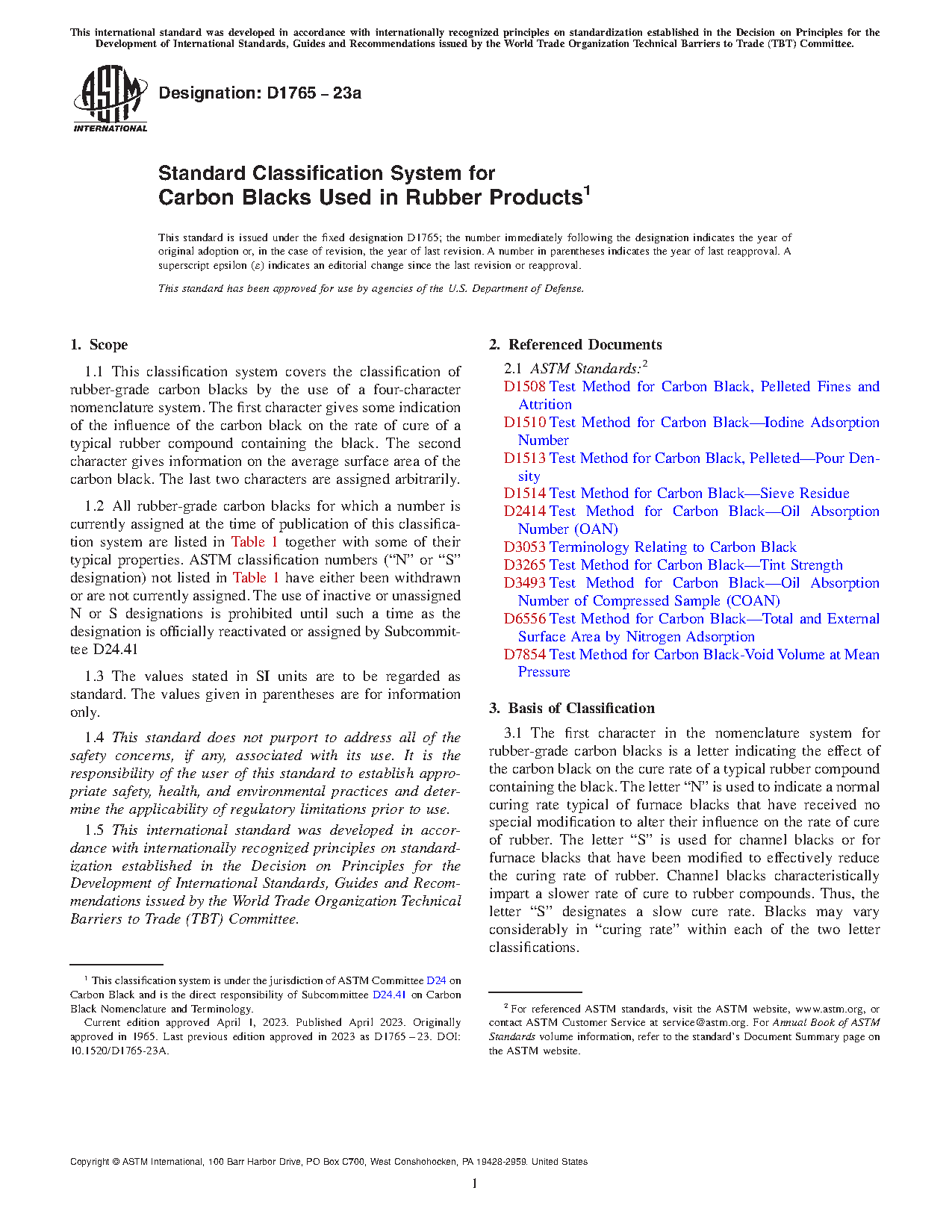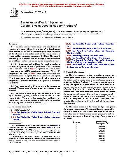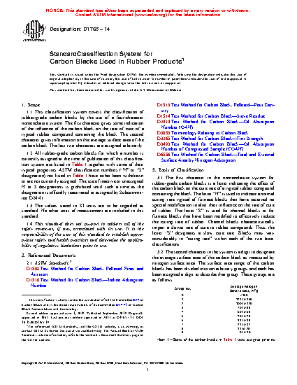 1.2 All rubber-grade carbon blacks for which a number is currently assigned at the time of publication of this classification system are listed in together with some of their typical properties. ASTM classification numbers ("N" or "S" designation) not listed in have either been withdrawn or are not currently assigned. The use of inactive or unassigned N or S designations is prohibited until such a time as the designation is officially reactivated or assigned by Subcommittee D24.41